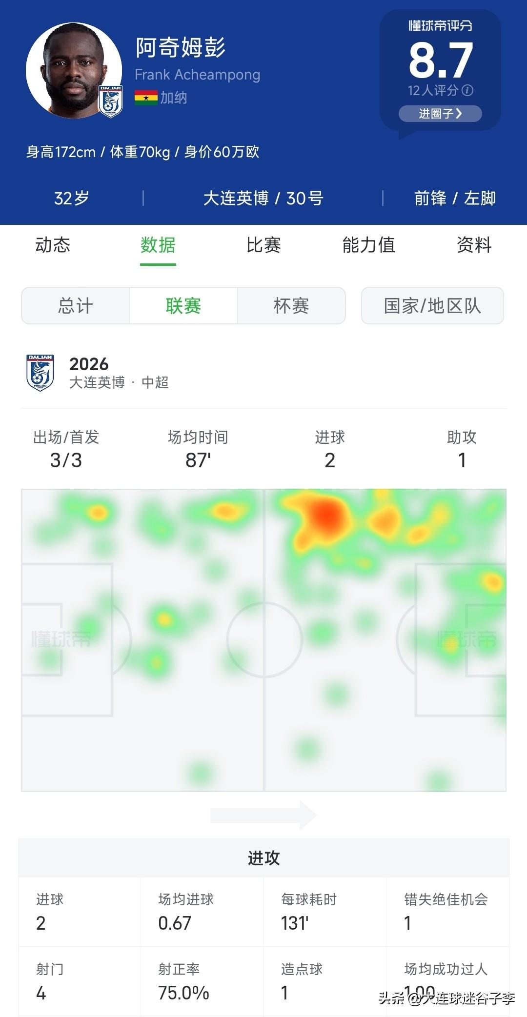 现在还有人质疑阿奇姆彭吗? 当初大连英博在冬窗最后时刻签下阿奇姆彭的时候,有不少球迷持反对声音,认为阿奇姆彭已经过气,速度不复巅峰,能力大打折扣。 如今,三轮联赛过后,阿奇姆彭为大连英博队攻入两球,为马莱莱送上一次助攻,创造一个点球由斯坦丘打进。在大连英博队进的五个球中,有四球和阿奇姆彭有关系。 虽然33岁的阿奇姆彭已不再年轻,但是他有丰富的经验,踢的也很聪明,很会用身体卡位,会造对手犯规,启动的那一下和临门一脚的功夫还在。 我相信随着联赛的深入,随着阿奇姆彭和队友的默契程度越来越高,他的表现也会越来越好,加油阿奇!
