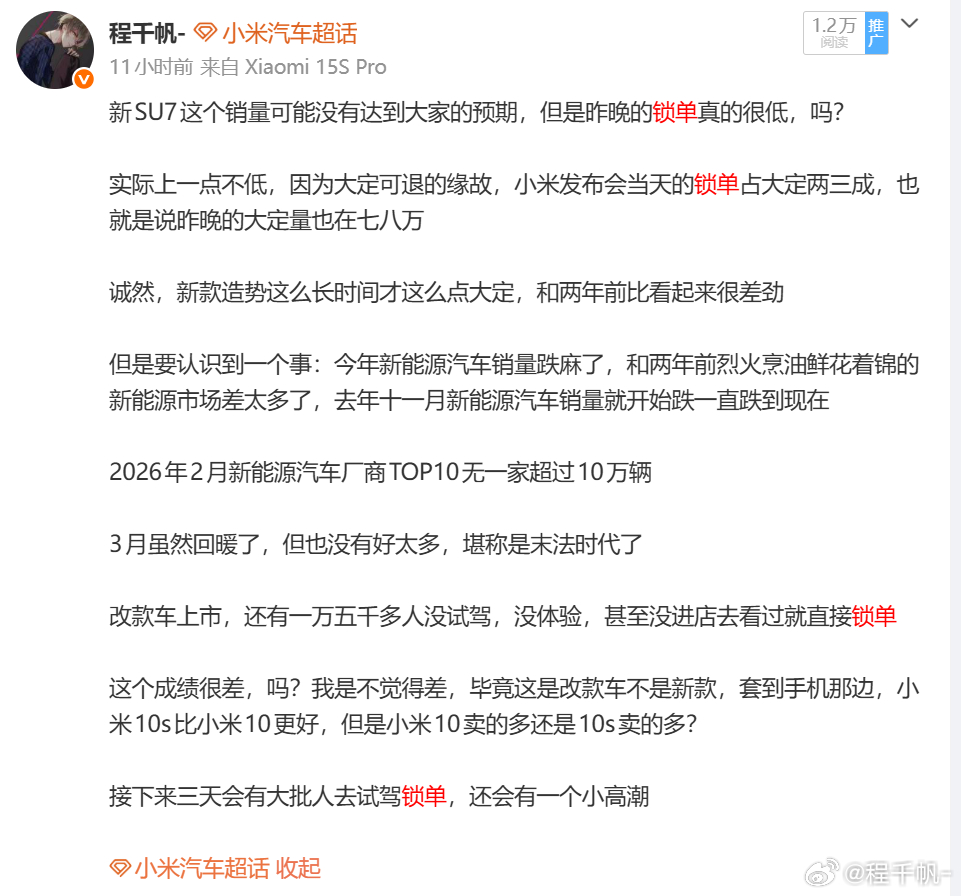 小米汽车回应为何不公布大定数字 我之前就说了,虽然与初代SU7对比,大家预期较高,但其实新SU7与初代SU7一样火爆,甚至还更优: