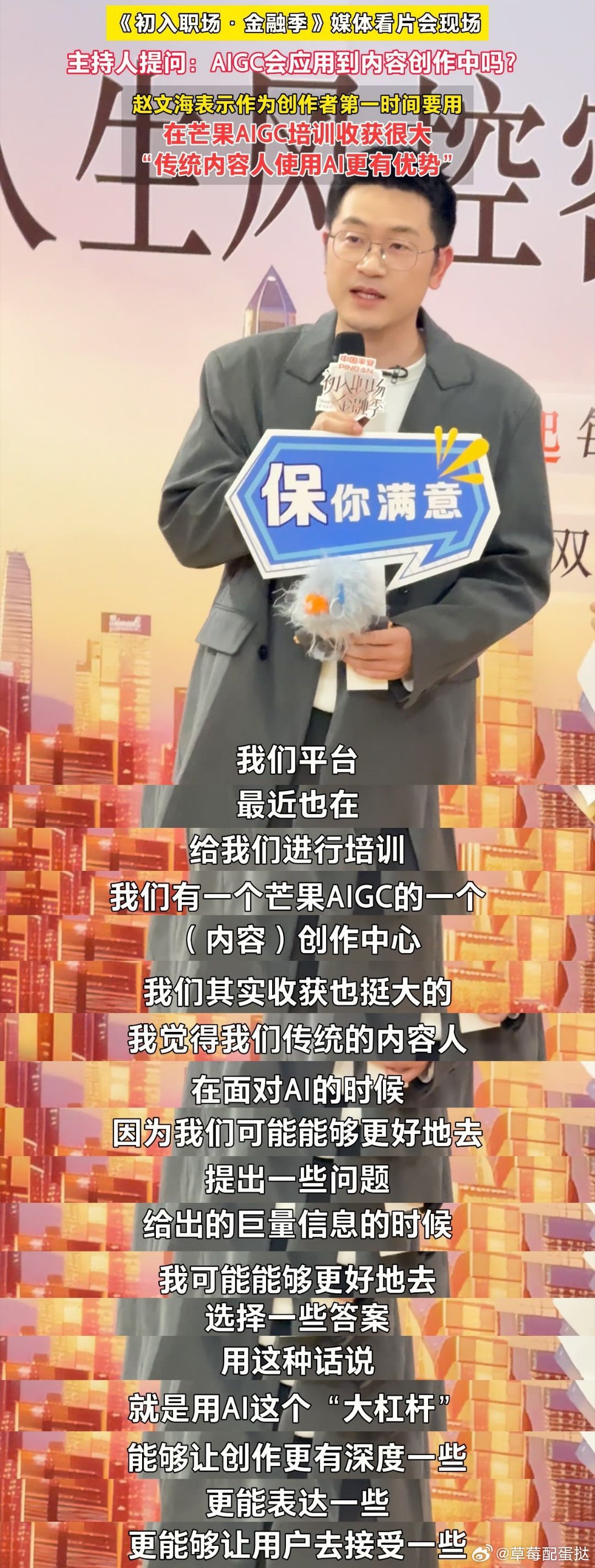 芒果制片人说创作者用AI更有优势初入职场金融季传统创作者+AI能擦出啥火花?芒果制片人赵文海看好内容人用AI的优势,还透露平台AIGC培训干货满满,坐等《初入职场·金融季》!