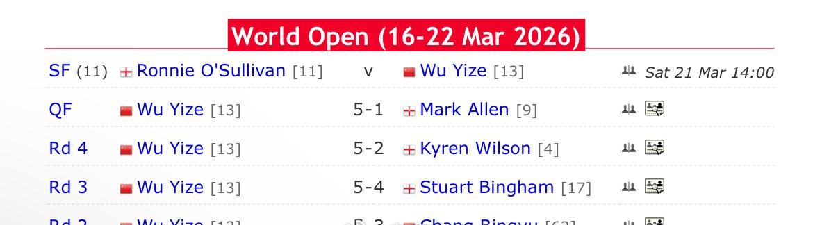 2026斯诺克世界公开赛中国独苗吴宜泽不负众望5:1轻取马克艾伦进入半决赛,下轮将对阵奥神,双方目前状态皆非常出色,都有单杆制胜能力,相较而言吴宜泽则更为稳定。整个系列赛中其对手基本都是前16选手,皆战而胜之。相对于丁俊晖、赵心童,作为年轻世代的吴宜泽攻防两端都相对稳定,使得其排名已稳步上升至前10,且具备良好的上升空间,其未来可期