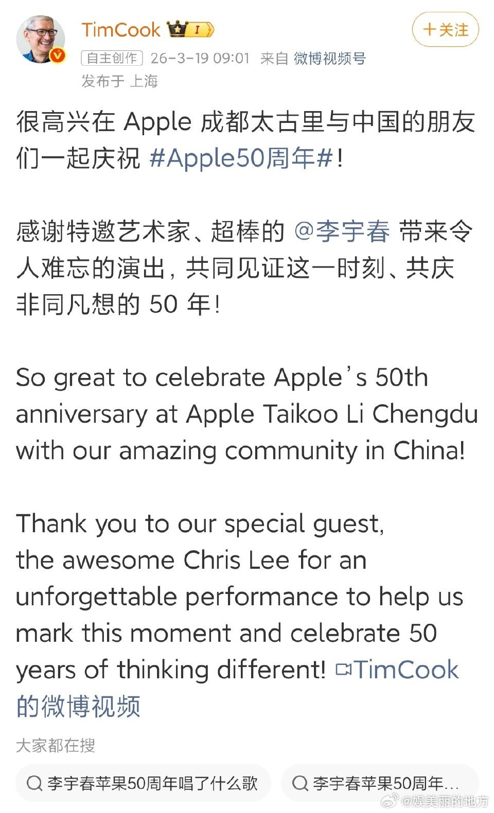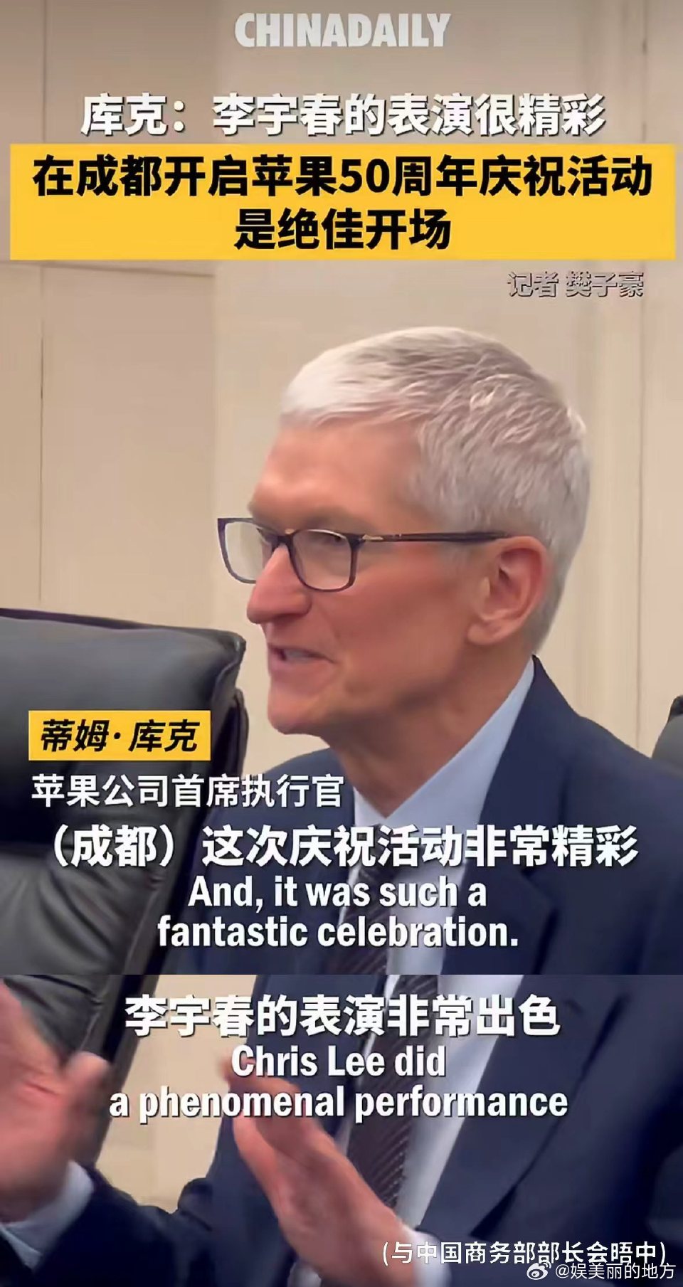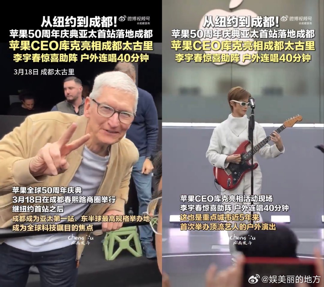 库克说李宇春的表演是现象级的 现象级评价实至名归,李宇春在苹果50周年活动中的舞台呈现,凭借实力征服库克,彰显中国艺人的国际影响力。