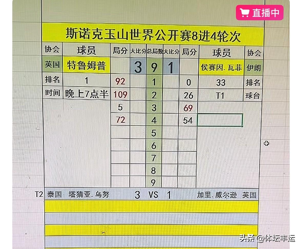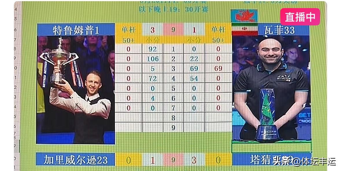 快讯,特鲁姆普、塔猜亚3-1分别领先瓦菲和加里威尔逊进入中场休息@1/4决赛,19:30时段两场比赛战报🆕⬇️⬇️ ✅贾德·特鲁姆普3-1(92-0、109-26、5-69、72-54)领先侯赛因·瓦菲; ✅塔猜亚·乌努3-1领先加里·威尔逊! 目前比赛的局势十分明朗,特鲁姆普和塔猜亚都占据着较大的优势。特鲁姆普在赛场上依旧保持着他那犀利的进攻风格,每一杆都充满了自信和力量。他的母球走位精准,常常能为自己创造出绝佳的进攻机会。而侯赛因·瓦菲虽然暂时落后,但他并没有气馁,每一次击球都全神贯注,试图寻找机会扳回比分。 另一边,塔猜亚·乌努的状态同样出色,他的击球节奏把握得恰到好处,冷静地应对着加里·威尔逊的每一次挑战。加里·威尔逊也展现出了强大的实力,在落后的情况下不断调整战术,寻找着特鲁姆普防守上的漏洞。 中场休息结束后,比赛将会更加激烈。特鲁姆普和塔猜亚能否继续保持领先优势,顺利晋级下一轮?而瓦菲和加里·威尔逊又能否实现逆转,创造比赛的奇迹?让我们一起拭目以待接下来的精彩对决!