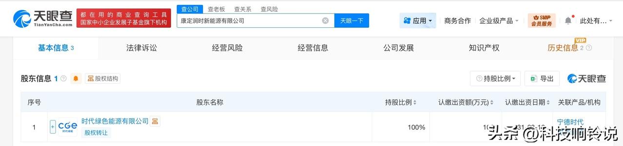 【宁德时代在康定成立新能源公司 注册资本1000万】 天眼查工商信息显示,近日,康定润时新能源有限公司成立,法定代表人为王强,注册资本1000万人民币,经营范围包括新兴能源技术研发、储能技术服务、风力发电技术服务、太阳能发电技术服务等。股东信息显示,该公司由宁德时代(300750)旗下时代绿色能源有限公司全资持股。 天眼查信息: