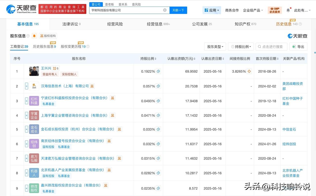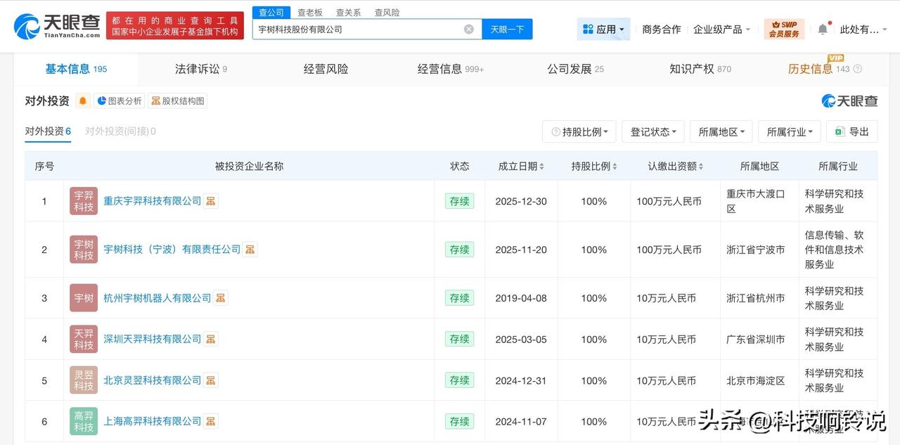 【宇树科技已成立多家子公司 宇树科技去年增资12500%】 据媒体报道,3月20日,上交所受理宇树科技股份有限公司科创板IPO申请,拟融资金额42.02亿元。 天眼查工商信息显示,宇树科技关联公司宇树科技股份有限公司成立于2016年8月,法定代表人为王兴兴,注册资本约3.64亿人民币,经营范围含软件销售、智能机器人的研发、智能机器人销售、工业机器人制造、工业机器人销售、机械设备研发等。股东信息显示,该公司由王兴兴、汉海信息技术(上海)有限公司、宁波红杉科盛股权投资合伙企业(有限合伙)、上海宇翼企业管理咨询合伙企业(有限合伙)等共同持股。 对外投资信息显示,该公司在内地直接持股6家企业,均为存续状态。值得一提的是,2025年以来,宇树科技已成立多家新公司,包括重庆宇羿科技有限公司、宇树科技(宁波)有限责任公司、深圳天羿科技有限公司。此外,该公司已多次增资并更名。 天眼查信息: