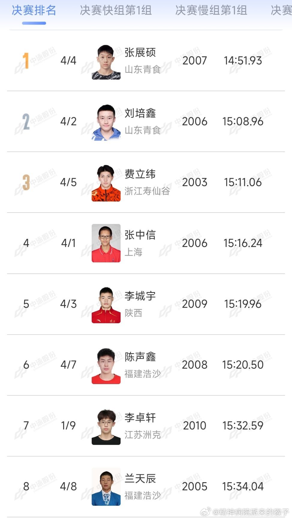 2026年中国游泳公开赛 男子1500米自由泳决赛:张展硕14:51.93获得冠军🥇刘培鑫15:08.96获得亚军🥈费立纬15.11.06获得季军🥉
