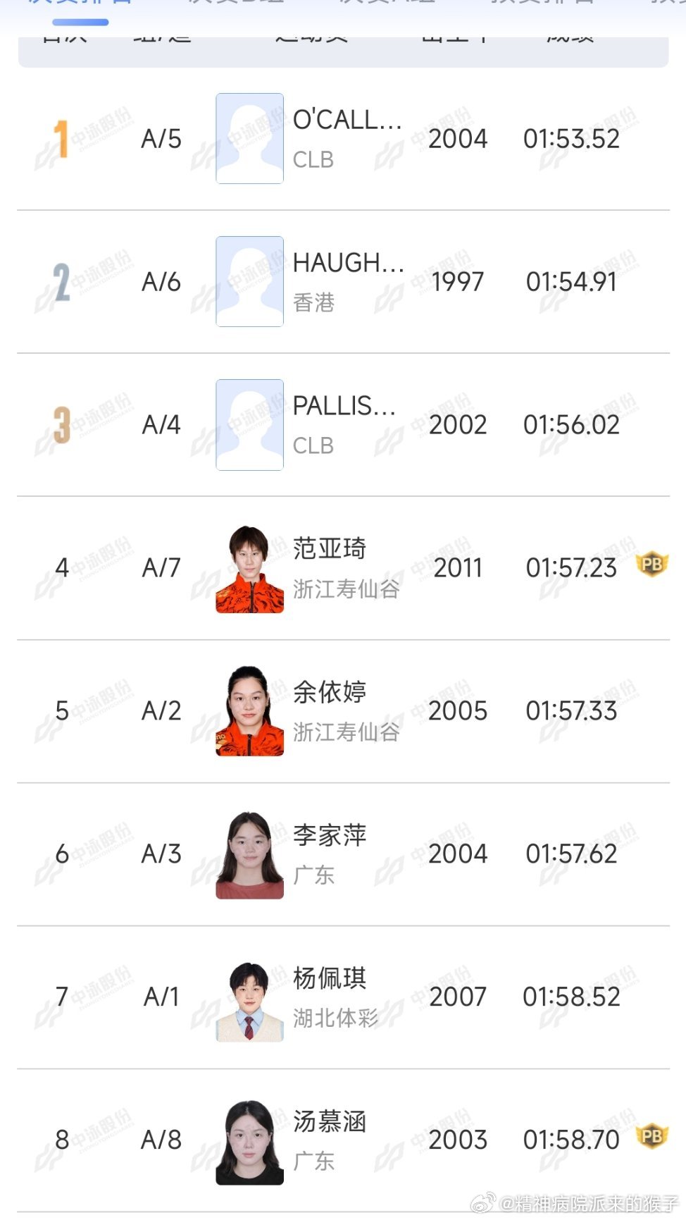 2026年中国游泳公开赛 女子200米自由泳决赛:奥卡拉汉1:53.52获得冠军🥇何诗蓓1:54.91获得亚军🥈帕里斯特1:56.02获得季军🥉范亚琦1:57.23刷新PB获得第四名余依婷1:57.33获得第五名