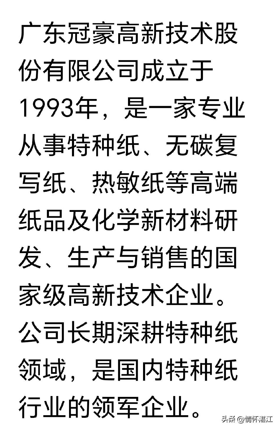 很多湛江市民可能不太知道广东冠豪高新技术股份有限公司,它成立于1993年,是湛江市经开区的一家老牌企业,是国内特种纸行业的领军企业,也是在湛江市本土成长起来的第一家上市公司,于2003年6月在上交所上市,股票代码为600433。