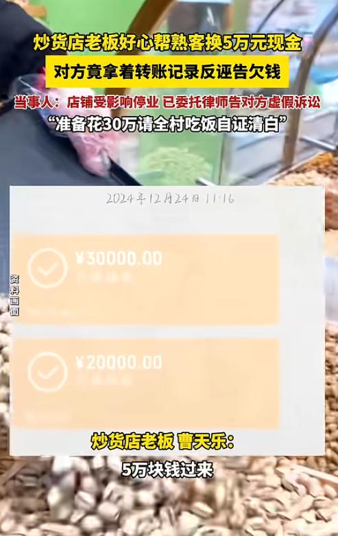 湖南,一男子开了家炒货店,一名老顾客说自己有急用,想换5万元现金,男子好心换钱后,没想到却被对方起诉欠钱5万,这件事让男子饱受争议,店铺也被迫关门,好在历经一年多维权,顾客主动撤诉,目前男子已委托律师控告对方虚假诉讼! 2024年10月,18岁的曹天乐在湖南沅江市南大镇开了一家炒货店,主要卖瓜子、花生等干货。 他年纪不大,但做生意实在,待人热情,镇上不少街坊都愿意来他店里光顾,其中有位比他大二十多岁的刘先生,是店里的常客,平时常来买东西,有时公司采购也会下大单,两人一来二去就熟了,还加了微信好友。 2024年12月底,刘先生找到曹天乐,说自己有急事要用现金,手机里的钱不方便取,想换5万元现金。 曹天乐想着对方是老顾客,平时也照顾生意,谁都有遇到难处的时候,就没多想,他当场收下了刘先生分两笔转来的5万元微信转账,没有备注任何用途,随后就把店里日常备货用的5万元现金交给了对方。 没过几天,刘先生又找上门,说家里还需要用钱,开口借5000元现金,曹天乐依旧没犹豫,把钱借给了他,这两次往来,全凭口头约定,既没写借条、收据,也没在转账里做任何标记。 一个多月后,事情突然变了味,刘先生拿着那5万元的转账记录找到曹天乐,一口咬定这钱不是换现金,而是曹天乐向他借的,要求他还钱。 曹天乐当场就懵了,跟对方解释是换现金,不是借钱,但刘先生不认可,没过多久,曹天乐就收到了法院的传票,刘先生以民间借贷纠纷为由,把他告上了法庭,要求归还5万元借款。 官司一打,曹天乐的生活彻底乱了,镇上消息传得快,大家都知道他被告欠钱的事,有人觉得他年纪小不懂事,真的欠了钱,也有人议论他是不是在外面骗钱。 各种流言蜚语满天飞,曹天乐走到哪都感觉有人在背后指指点点,原本常来的老顾客不敢来了,店里的生意一天比一天差,进货、房租都成了问题,最后实在撑不下去,只能关门停业。 好好的生意没了,名声也毁了,曹天乐心里又委屈又憋屈,但他始终坚信自己没做错,一定要讨个清白。 法庭上,刘先生坚持说5万元是借款,还编造曹天乐承诺年后还钱并给5000元报酬的说法。 但他拿不出任何能证明是借款的证据,没有借条,没有聊天记录,也没有约定过还款时间。 法院审理后认为,两人认识时间不长,没有大额借款的基础,刘先生的说法不符合日常借贷的常理,2025年6月,法院一审判决驳回刘先生的全部诉讼请求。 刘先生不服,提起上诉,二审法院依旧维持原判,认定借贷关系不成立,本以为事情到此结束,没想到刘先生又换了个理由,以不当得利为由再次起诉曹天乐,还是要那5万元。 曹天乐没有退缩,继续应诉,他清楚记得当时是当场换的现金,不存在不当得利的情况。 庭审时,法官也觉得事实基本清楚,提议调解,但曹天乐坚决不同意,他要的不是妥协,是彻底的清白,直到2026年3月,刘先生眼看证据不足,事实说不清楚,才主动向法院申请了撤诉。 这场持续一年多的闹剧,终于以刘先生撤诉画上句号,曹天乐虽然赢了官司,但店铺没了,名声也受了不小的影响,这一年多的委屈和压力,只有他自己知道。 为了维护自己的合法权益,也为了惩罚对方的恶意行为,曹天乐已经委托律师,正式控告刘先生虚假诉讼,希望通过法律途径,让恶意诬告的人承担应有的责任。 这件事也给不少人提了醒,不管是熟人还是朋友,涉及金钱往来,尤其是大额转账、换现金、借钱时,一定要留好凭证,转账备注清楚用途,必要时写好字据,别因为一时好心,没留个心眼,最后给自己惹来不必要的麻烦。 以上都是个人观点,对此您有什么不同的看法,可以在评论区留言讨论!!!