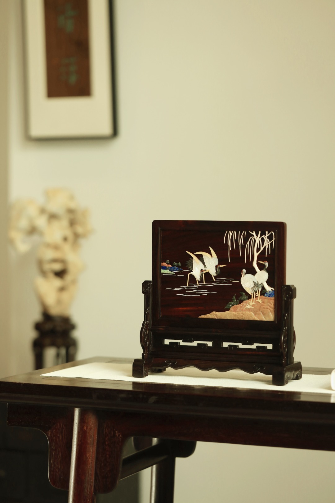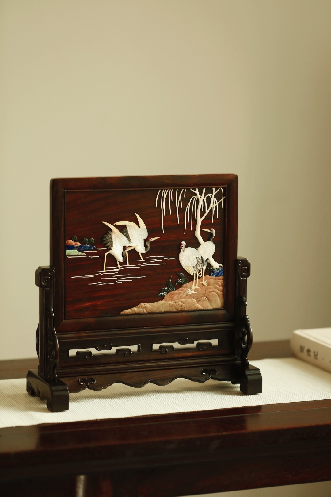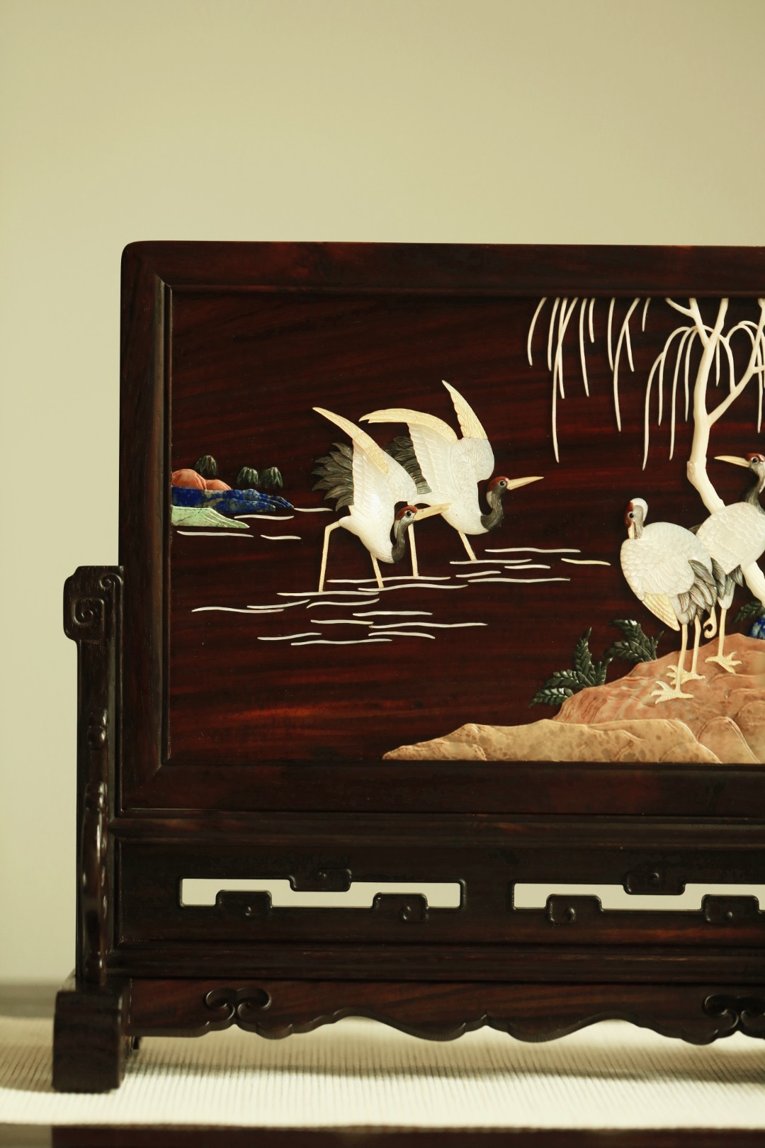 大红酸枝攒框,古韵新作,独板屏心百宝嵌群鹤图;配色典雅,寓意吉祥,置案清赏,添祥和雅意。