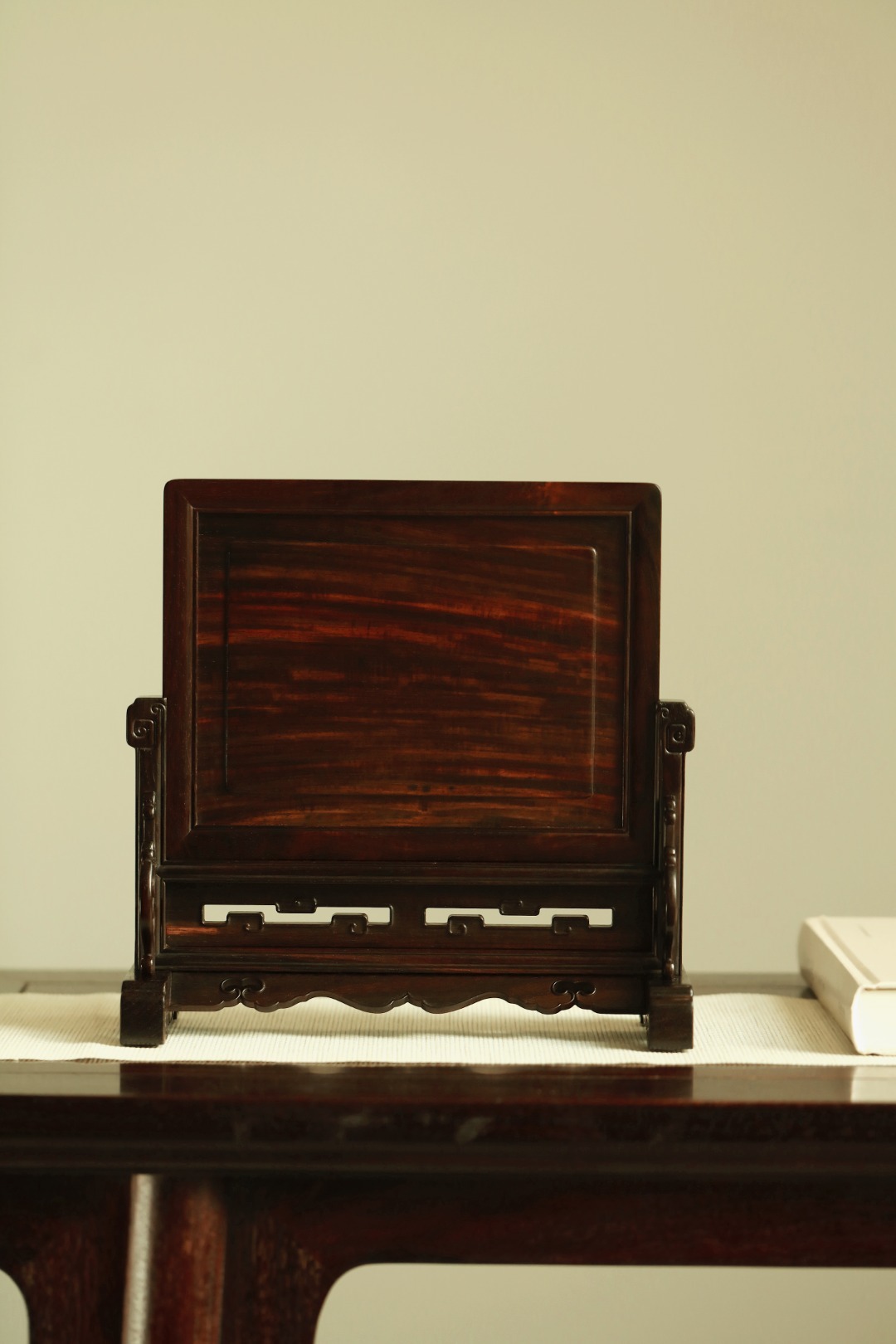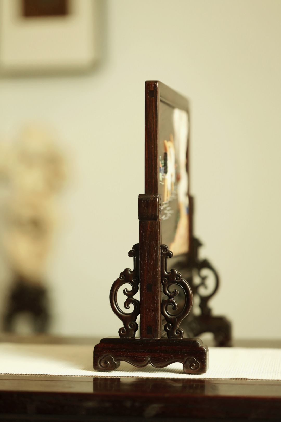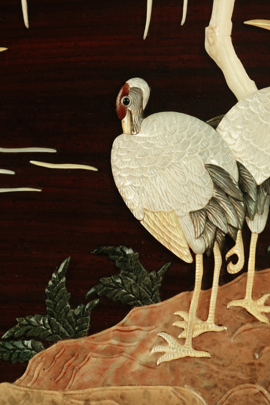 大红酸枝攒框,古韵新作,独板屏心百宝嵌群鹤图;配色典雅,寓意吉祥,置案清赏,添祥和雅意。