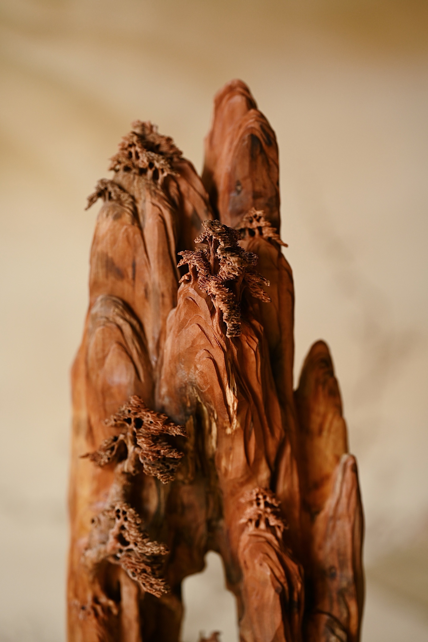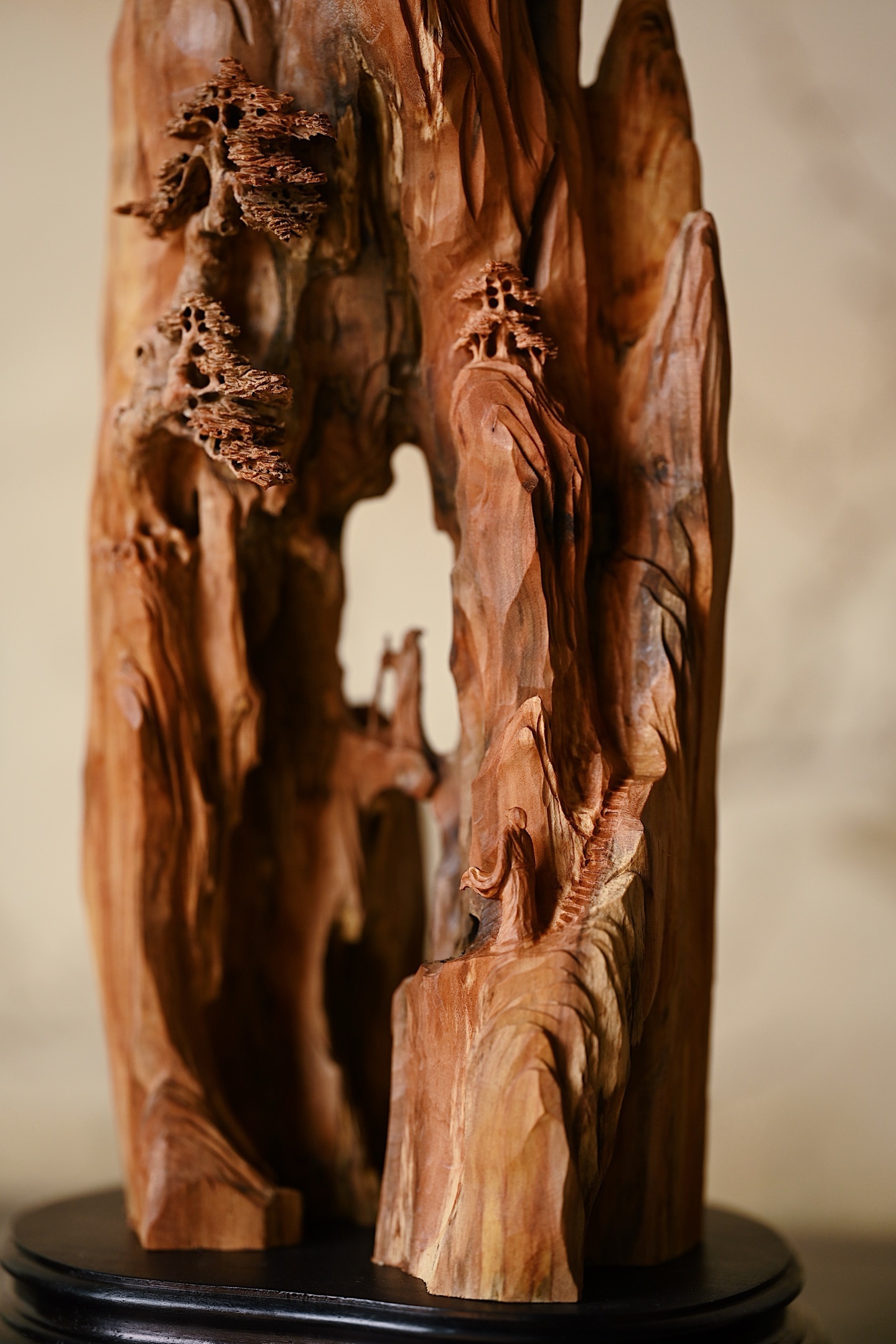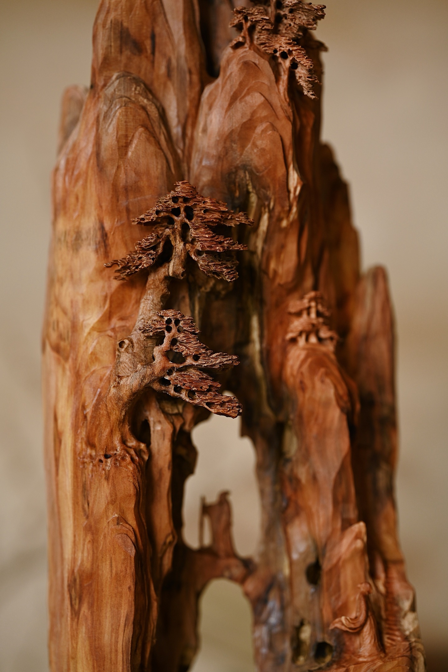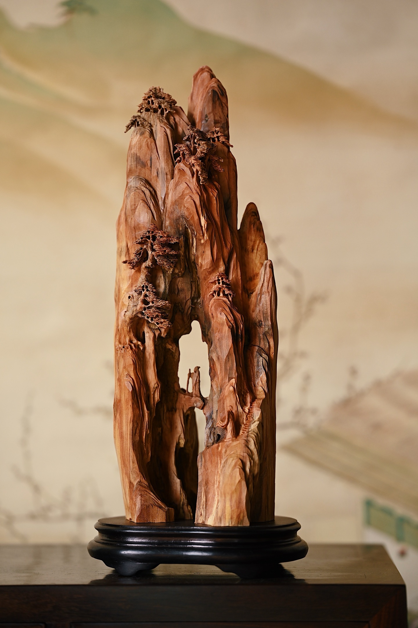 此件取天然檀香根料为材,随形雕刻,山势陡峭险峻,孔洞通透,如云雾缭绕其间;松针细密苍劲,盘根错节,将山水意境凝于方寸之间,藏着东方文人“寄情山水”的精神向往。