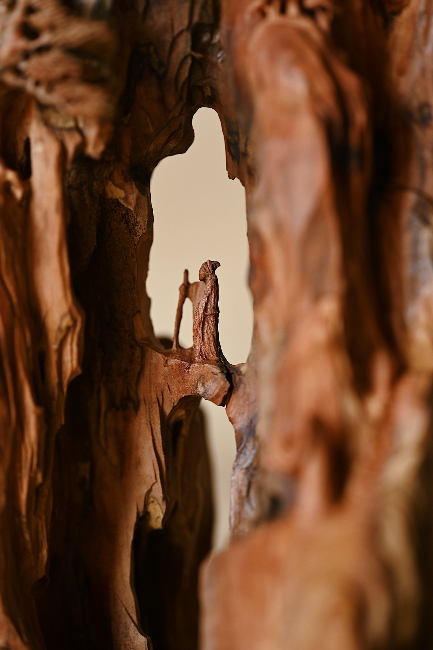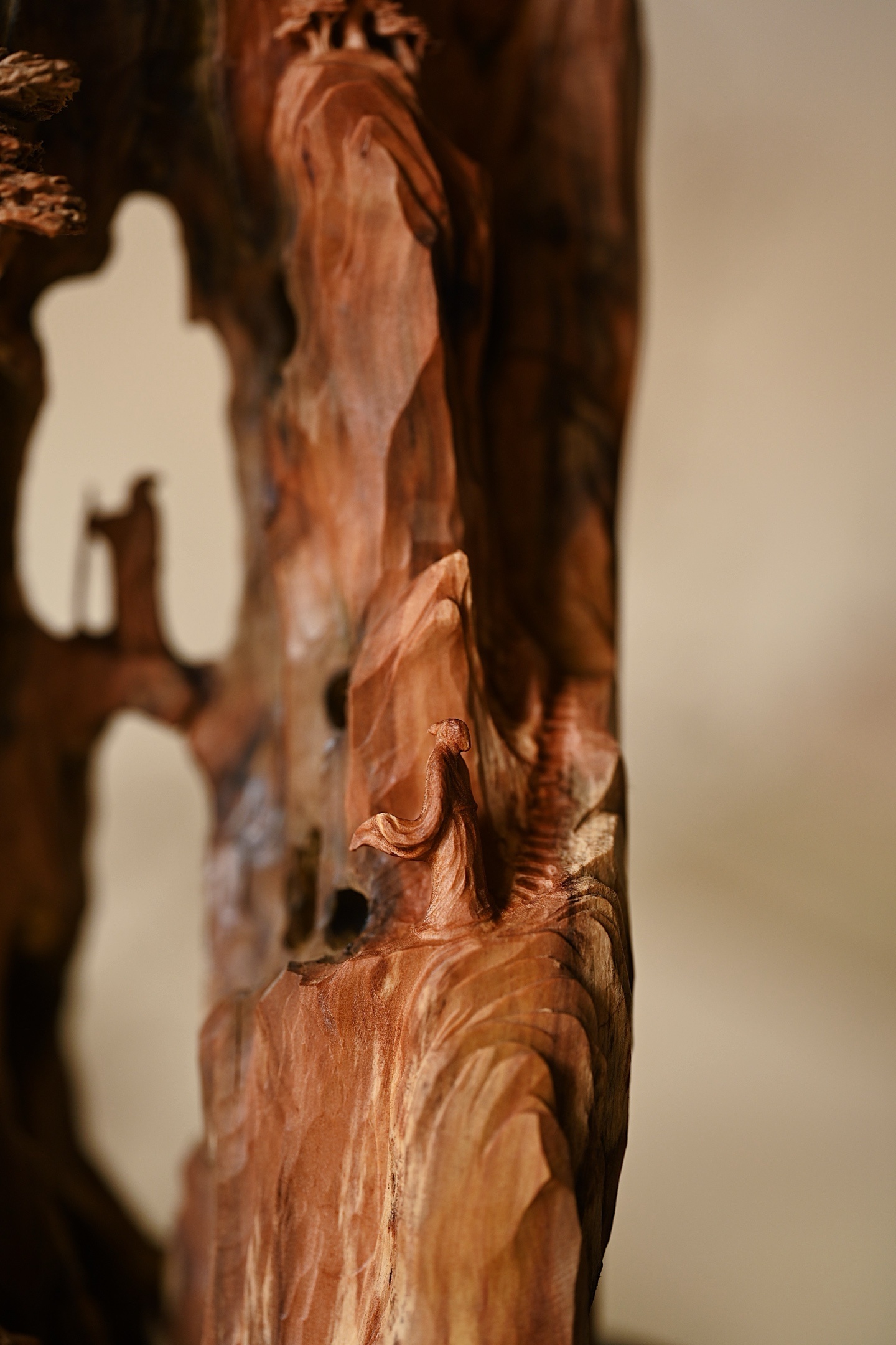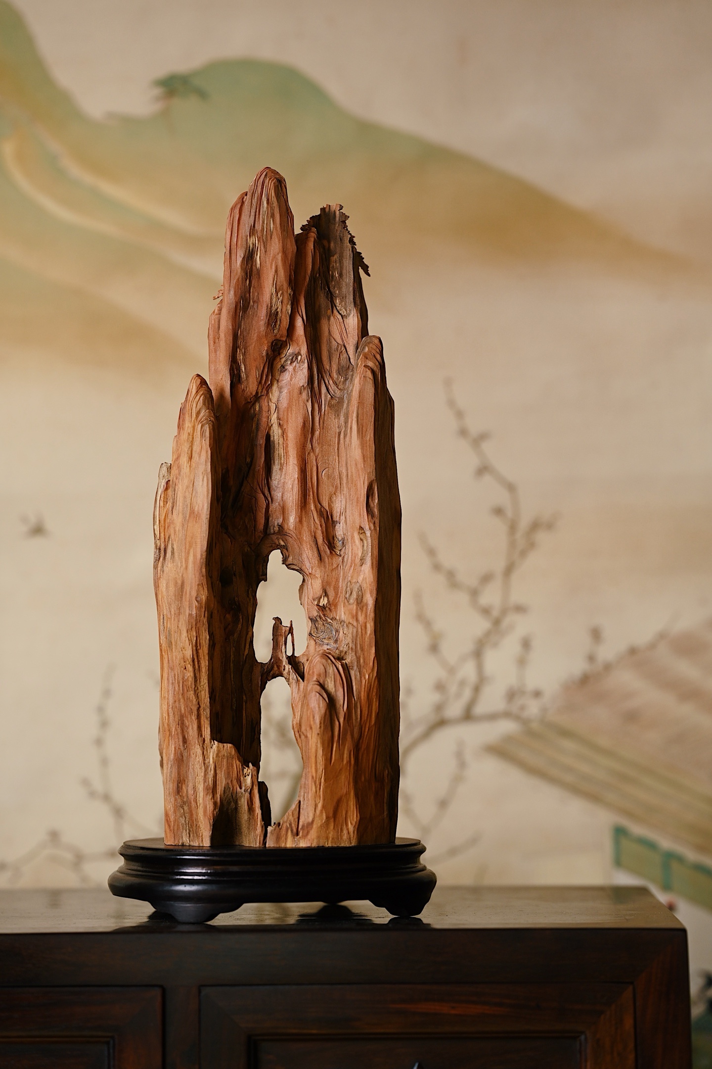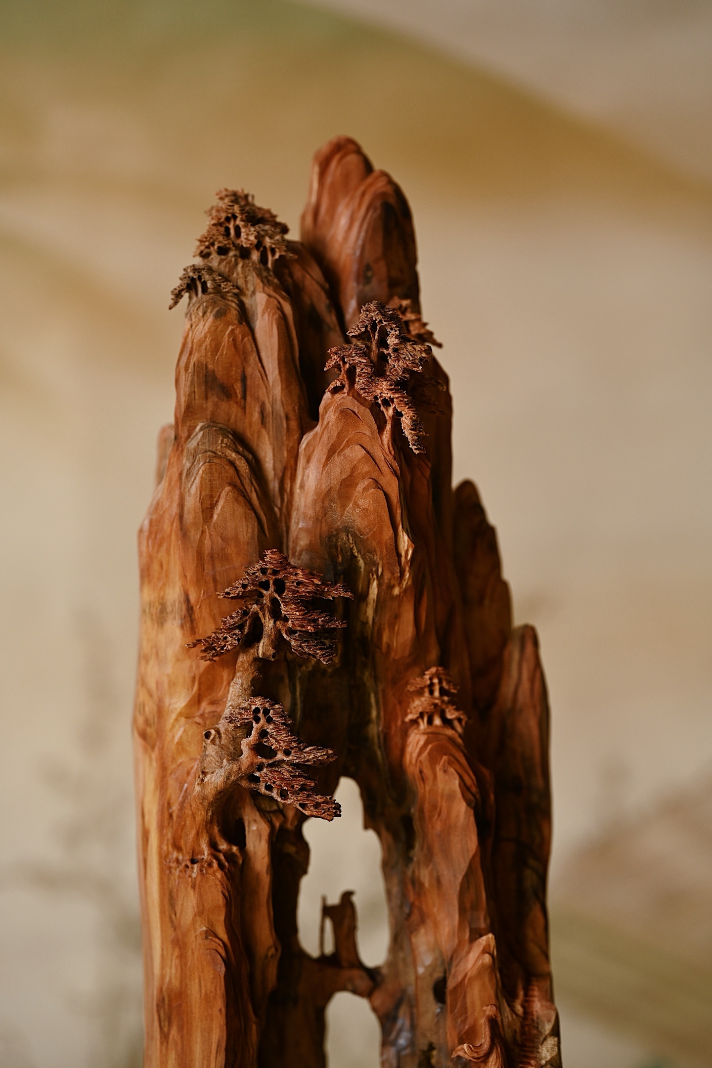 此件取天然檀香根料为材,随形雕刻,山势陡峭险峻,孔洞通透,如云雾缭绕其间;松针细密苍劲,盘根错节,将山水意境凝于方寸之间,藏着东方文人“寄情山水”的精神向往。