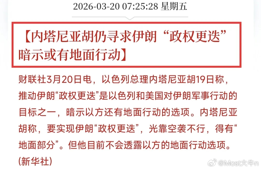 内塔尼亚胡再次重申:要实现伊朗“政权更迭”,光靠空袭不行,还得有“地面部分”,暗示将来会采取地面行动,进攻伊朗。