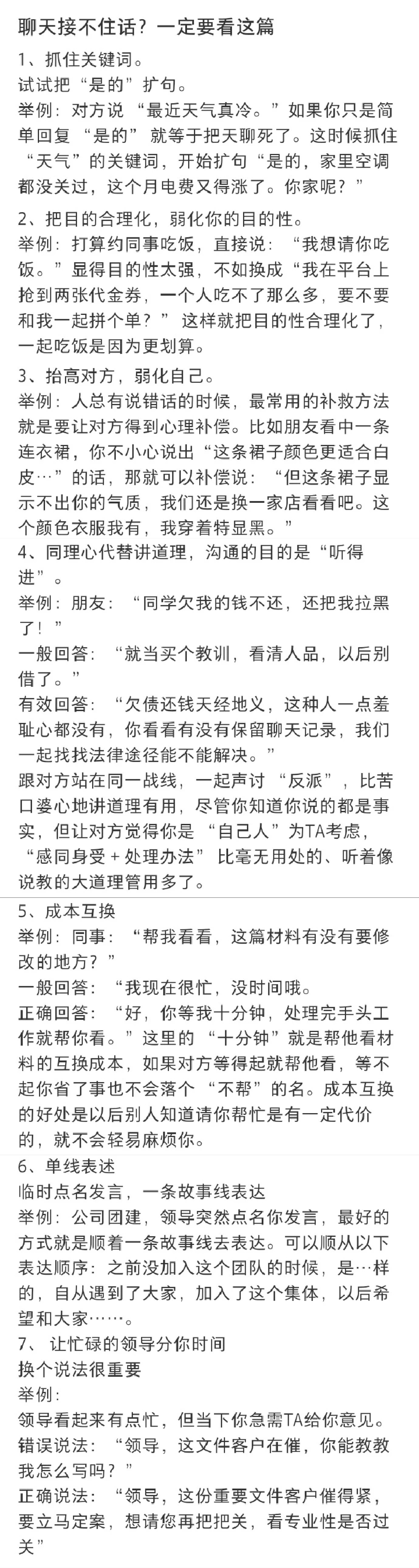 尽量不和别人聊的12件事:不透露存款、不聊健康隐疾、不辩三观差异、不聊职场是非、不说教不劝善、不传播负面情绪、不谈情纠和家事、不评价他人的选择、不聊他人是非长短、不聊自己的弱点和恐惧、不讲没谱的计划和梦想、要么不听要么守好秘密。