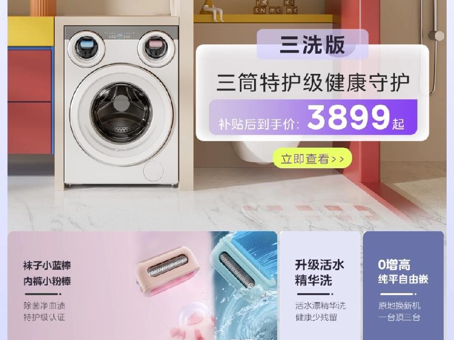分区洗烘的“生活美学” 内衣和袜子能一起洗吗? 以前我会说“NO”,现在我会说“当然”。 美的可爱多三筒分区洗烘套装的上筒,是“内衣专属区”:用“元气棒”的高温蒸汽洗,能杀死99.99%的细菌;中筒是“外套区”,用“顽渍净”模式,轻松洗掉火锅味;下筒是“床单区”,用“大件烘”模式,烘完的床单像刚晒过的云朵。 有次朋友来我家,看到三个筒同时工作,惊讶地说:“你家洗衣机是‘三头六臂’吗?”我笑着说:“它是我的‘生活助手’——以前洗一次衣服要半天,现在一小时搞定,剩下的时间,我们可以一起吃可爱多。”三筒洗衣机的内部特写,上筒放内衣,中筒放外套,下筒放床单,旁边是用户笑着递可爱多给朋友的画面。