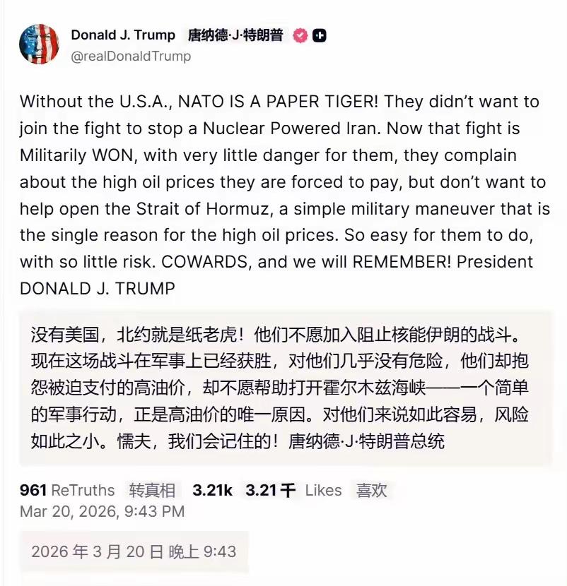 特朗普又向北约“开炮”了!称“没有美国,北约就是“纸老虎”。 当地时间3月20日,他在“真实社交”发文批评北约应对伊朗问题的表现,直言“没有美国,北约就是纸老虎”。 他指出,在遏制“核武化伊朗”行动中,北约国家不愿参与军事行动,等冲突取得军事胜利且风险低了,又抱怨高油价。他认为高油价是霍尔木兹海峡运输没恢复畅通导致的,还说这本是“简单军事行动”,北约却不愿协助。他用“懦弱”形容相关国家,还强调“美国会记住”。 特朗普很生气,此番言论无疑撕开了美国与北约内部矛盾的口子,必将给今后的美欧关系带来破坏性影响。美国自恃为北约老大,全然不把北约其他各国放在眼里。但北约其他成员国也明白了,跟着美国瞎折腾最后遭殃的只会是欧洲。俄乌战争就是最深刻的教训,美国半路下车,一拍屁股走人,把乱摊子甩给了欧洲,是真坑人呀。不但如此,美国还对丹麦加拿大北约盟友下手,是六亲不认,竟然连自己人都想打。所以,欧洲各国再也不敢盲从美国,更不愿再当美国的全球战略棋子。 可以预见,北约内部的裂痕会随着此次事件不断扩大,不排除美国威胁推出北约,从而导致北约正式走向分崩离析。