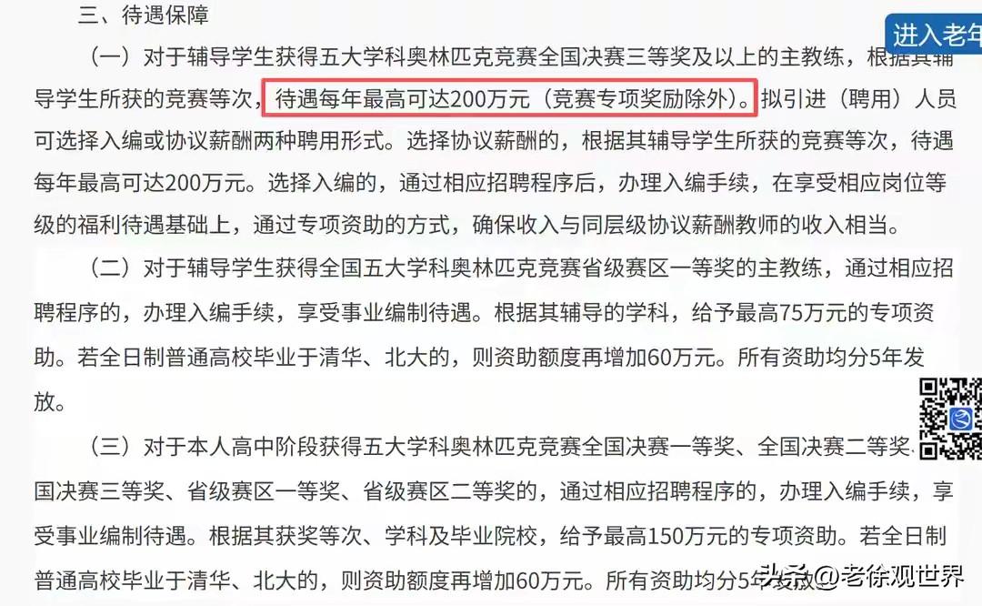豪横!浙江台州某高中,公开招聘数理化竞赛教练。面向全国招聘特别优秀的老师,专门辅导高中数理化竞赛。 其要求不可谓不低,要求教练自己获得过相关竞赛一二等奖,或者是亲自辅导出来过获奖的学生。 当然待遇方面也是让人叹为观止-最高约200万年薪!这真是有钱啊,财大气粗,豪横!高三竞赛 初中竞赛试题 台州招教面试 临海教师招聘 台州招教 中学学科竞赛