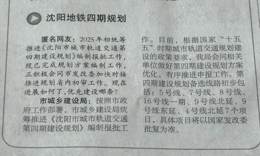 沈阳地铁四期规划最新动态: 在“十五五”规划下,有序推动第四期地铁规划及申报工作,目前继续提报7条地铁线路,分别为,5号线、7号线、8号线、16号线一期、9号线北延、9号线东延、4号线北延,具体国家发改委批复! 外加目前建设及2027年即将完毕的累计线路为1/2/3/4/6/9/10号线,2035届时沈阳实现东北亚地铁最为密切的城市,达到和东京,首尔并肩的三大地铁城市,届时引以为傲东京在沈阳面前只算一个小弟弟! 宏伟的画卷当属于当代沈阳人抒写,奋力拼搏为后人留下巨大幸福感,城市更好,生活更幸福!