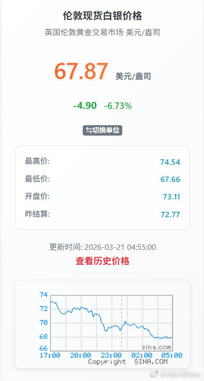 【现货黄金再跌破4500美元白银失守68美元】3月21日,现货黄金失守4500美