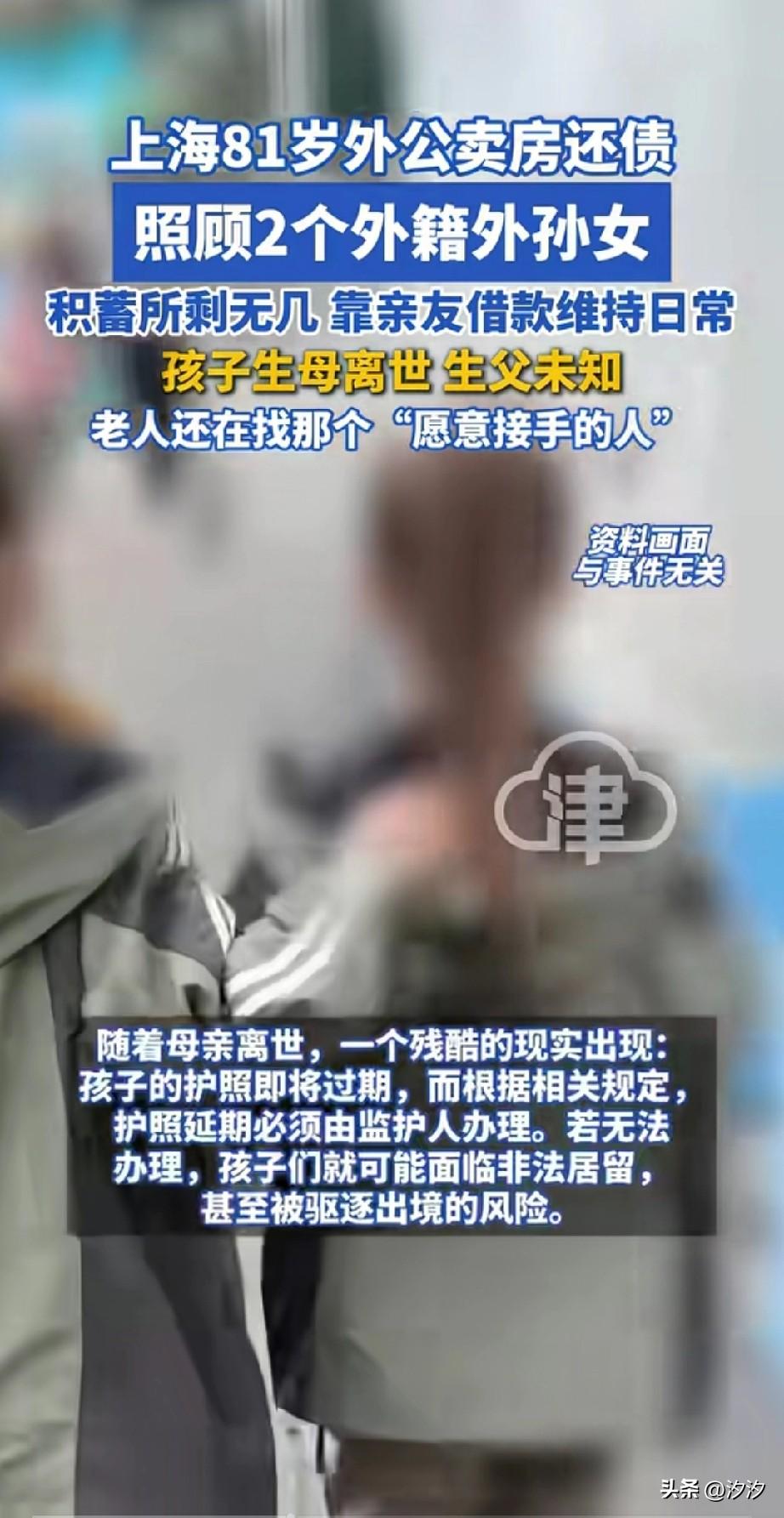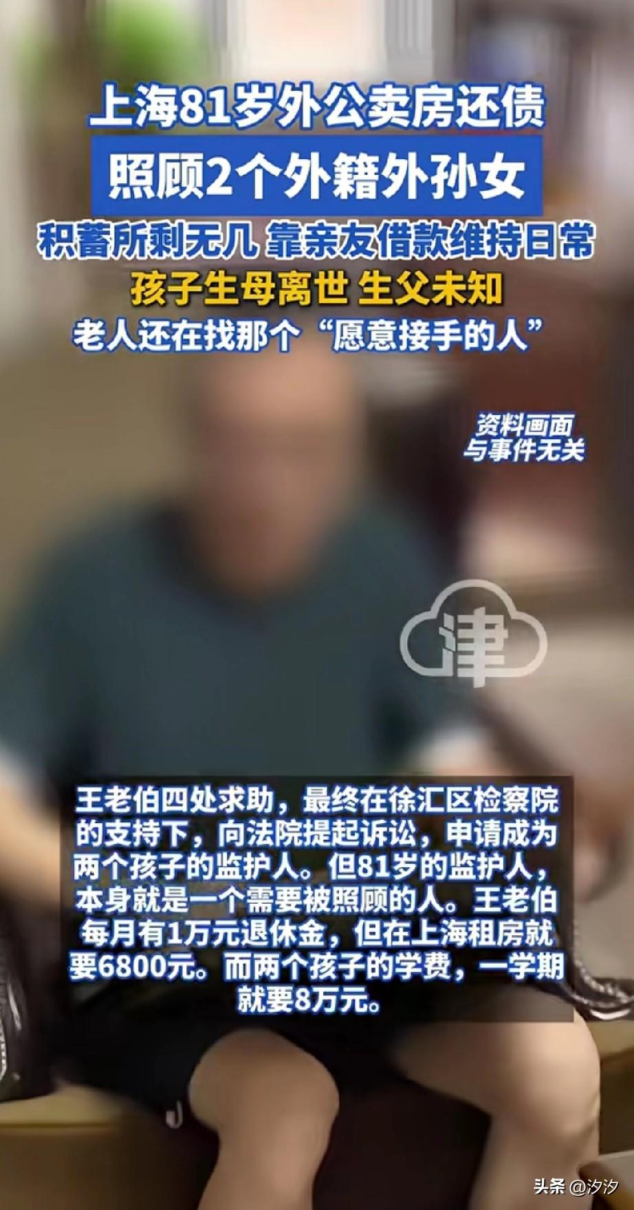 上海退休外公真是好人, 居然卖房还债, 这一切都因为两个美国籍的外孙女, 81岁的退休老人照顾两个外国籍的外孙女,她们的母亲意外离世, 老爷子这么大年龄了, 还要照顾两个美国籍的孩子, 一个月退休金只有1万块, 两个孩子的一学期学费就高达8万元, 这让老人不停的借钱, 如今不得不把房子卖了还债, 她们还要出去租房, 在上海租房一个月需要6800元, 10岁的朵朵美国签证很快就要过期了, 最终在法院的帮助下, 孩子的外公成为了她们的监护人, 否则她们就要被驱逐出境了, 所以嫁给老外的女生要注意, 些老外本身就不负责任, 你在的时候相处融洽, 当你不幸离开的时候, 他们很有可能不要孩子直接消失, 老a说的一点都没错, 这可是真实的事件, 那些天天吹嘘跨国恋的女生, 可要看清楚了, 不要发生在自己身上, 才知道肉疼, 还连累自己的家人! 大家对于上海81岁的这名外公照顾两个外籍外孙女怎么看? 上海 单亲外婆带外孙