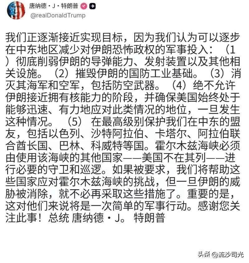 特朗普发帖称考虑逐步减少在中东的军事行动! 唐纳德·J·特朗普:我们正逐渐接近实现目标,因为我们认为可以逐步在中东地区减少对伊朗恐怖政权的军事投入:(1)彻底削弱伊朗的导弹能力、发射装置以及其他相关设施。(2)摧毁伊朗的国防工业基础。(3)消灭其海军和空军,包括防空武器。(4)绝不允许伊朗接近拥有核能力的阶段,并确保美国始终处于能够迅速、有力地应对此类情况的地位,一旦发生这种情况。(5)在最高级别保护我们在中东的盟友,包括以色列、沙特阿拉伯、卡塔尔、阿拉伯联合酋长国、巴林、科威特等国。霍尔木兹海峡必须由使用该海峡的其他国家——美国不在其列——进行必要的守卫和巡逻。如果被要求,我们将帮助这些国家应对霍尔木兹海峡的挑战,但一旦伊朗的威胁被消除,就不必再采取这些措施了。重要的是,这对他们来说将是一次简单的军事行动。感谢您关注此事!总统唐纳德·J。特朗普特朗普炮轰伊朗 美、以对伊朗这次开战,并没有做好准备仓促开战;激光拦截无人机武器美军、以军都进行了多次实验效果不错,但并没有在对伊朗的实战中应用;美军同俄罗斯军队一样没有认识到乌克兰军方已经改写了战争史——无人机