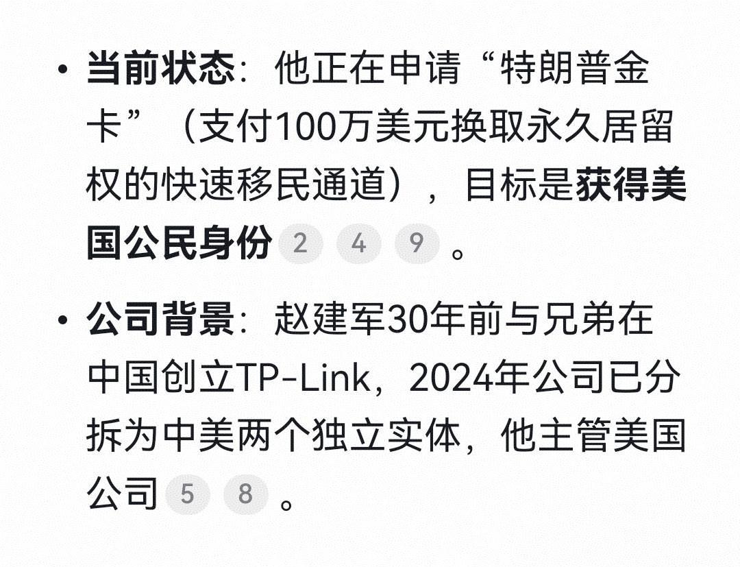 据外媒报道,路由器巨头TP-LINK创始人(应该是联合创始人之一赵建军)正在申请“特朗普金卡”,以求获得快速居留许可,然后期望企业被视同美国企业。这是昨天的热点新闻,可能是真的,也可能是老美放出的烟雾弹,想让中国那些面临美国制裁的企业家们效仿。如果是真的话,大家也别急,因为TP-LINK(普联)已经拆封成两个独立的公司,赵建军负责北美的公司,母体公司由弟弟、另一个联合创始人赵佳兴负责。只不过如果赵建军走到脱籍那一步,国家应认认真真计算一下脱籍税。总要有些手段,才能让有些人记得住东南西北、娘在哪里!