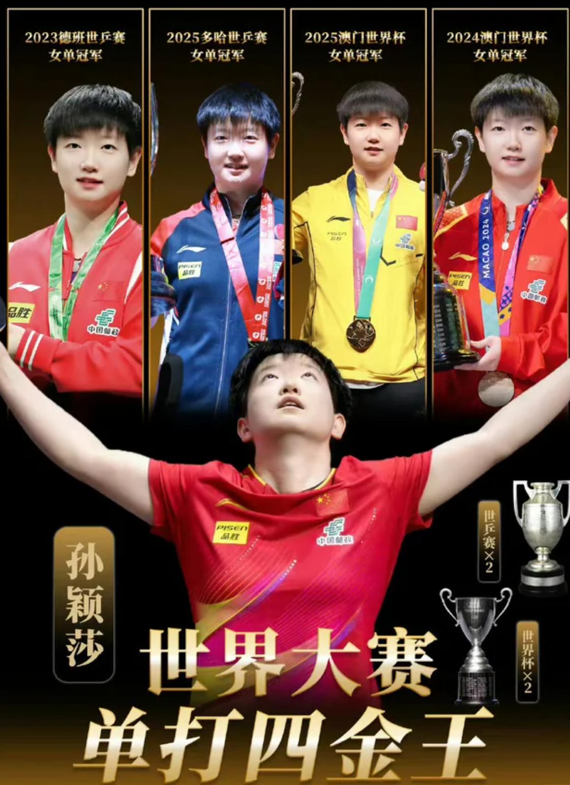 孙颖莎冲击三连冠,国乒历史上仅樊振东实现过。三连冠是史无前例(女单从未有人做到),等于莎莎超越刘诗雯、成为新传奇。 刘诗雯5次世界杯冠军历史最多,她有机会追平/破纪录 女单从未三连冠,莎莎2025已卫冕,2026再赢就是历史突破 三连冠 = 历史级成就 国乒历史上,世界杯单打冠军最多的女选手是刘诗雯(5次:09、12、13、15、19年)。 男单樊振东实现过三连冠(18、19、20年)。 女单三连冠?历史上从未有人做到。 直到孙颖莎。 2024年澳门世界杯,她首次夺冠;2025年成功卫冕。 2026年澳门世界杯3月30日开打,如果她再赢一次,就将成为女单史上首位三连冠得主! 这不只是数字突破。 这是她用实力告诉世界:她早已不是“接班人”,而是开创自己时代的领军者。 从伦敦世乒赛主办方亲选她放C位,到26个代言排队等她, 从李隼教练心疼她“黄金八年牺牲单打”,到全球球迷熬夜追她, 莎莎的影响力早已超越赛场。 她让外国孩子走进球馆学她的正手,让海外媒体主动报道乒乓球。 她把国球焊在了全球顶流赛道上。 莎莎有望成为女单新传奇,书写属于她的时代 过去女单冠军分散,缺少绝对统治者 粉丝心疼莎莎一路拼到现在,终于有机会封神 为她加油,为中国乒乓骄傲!