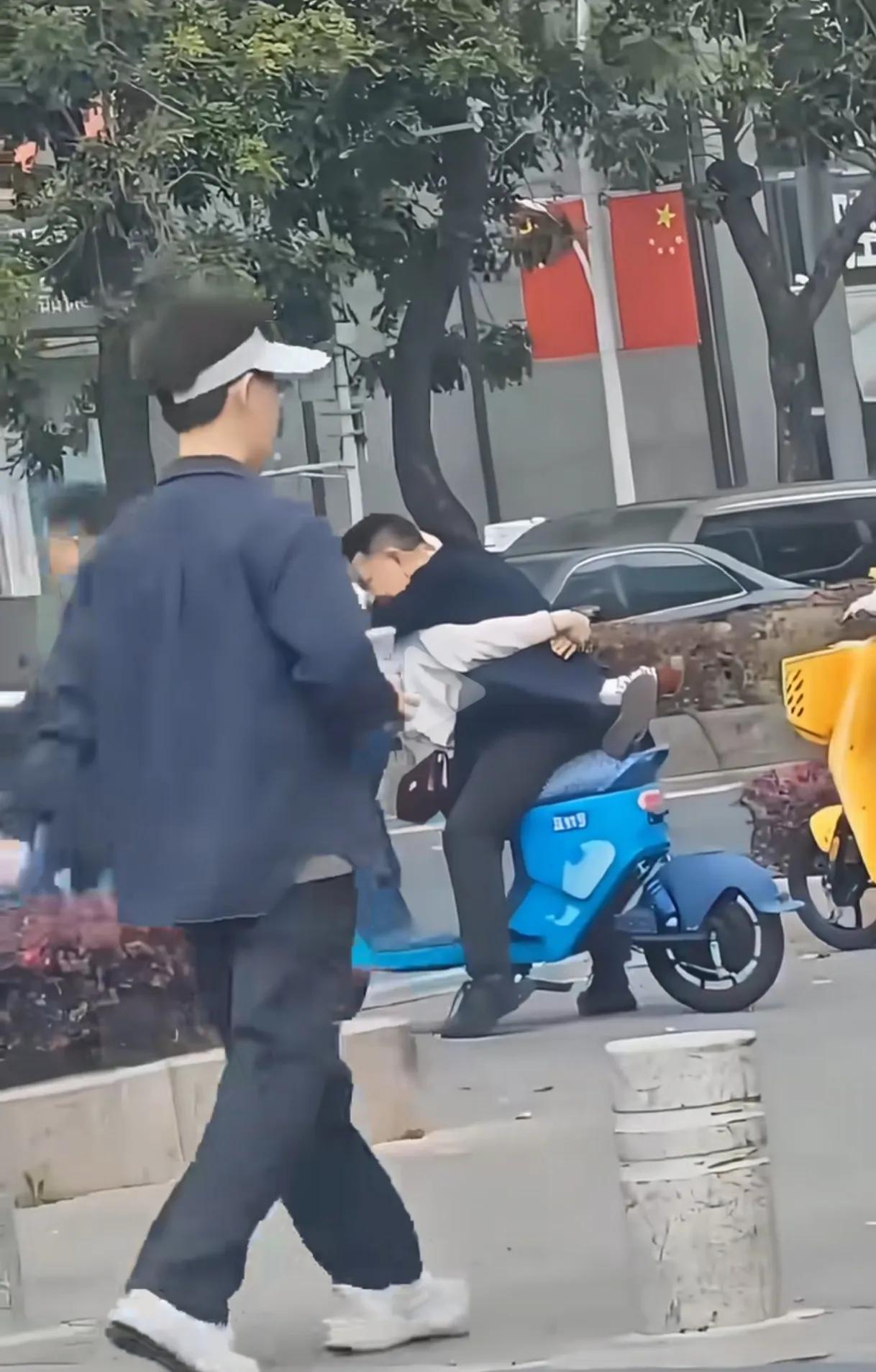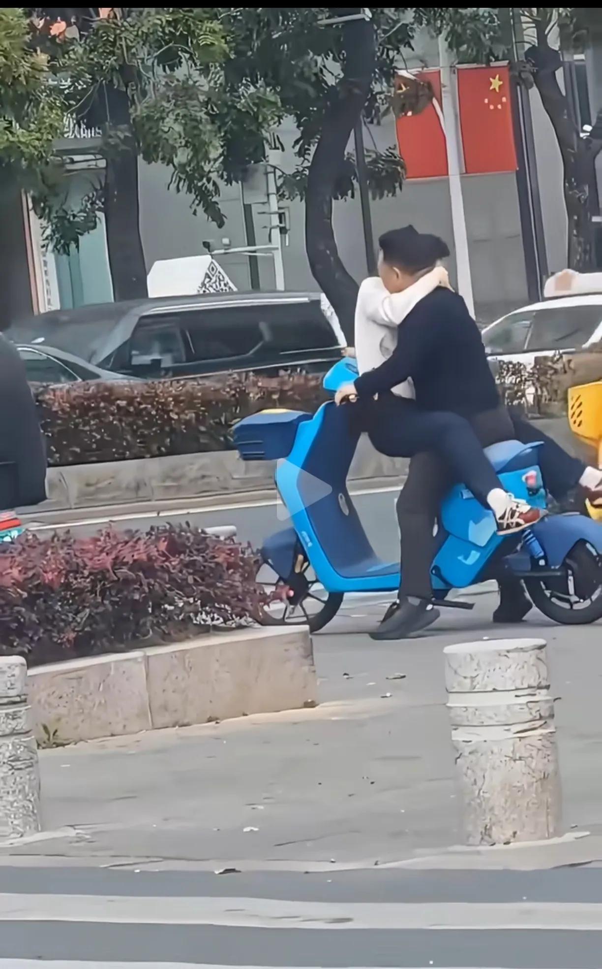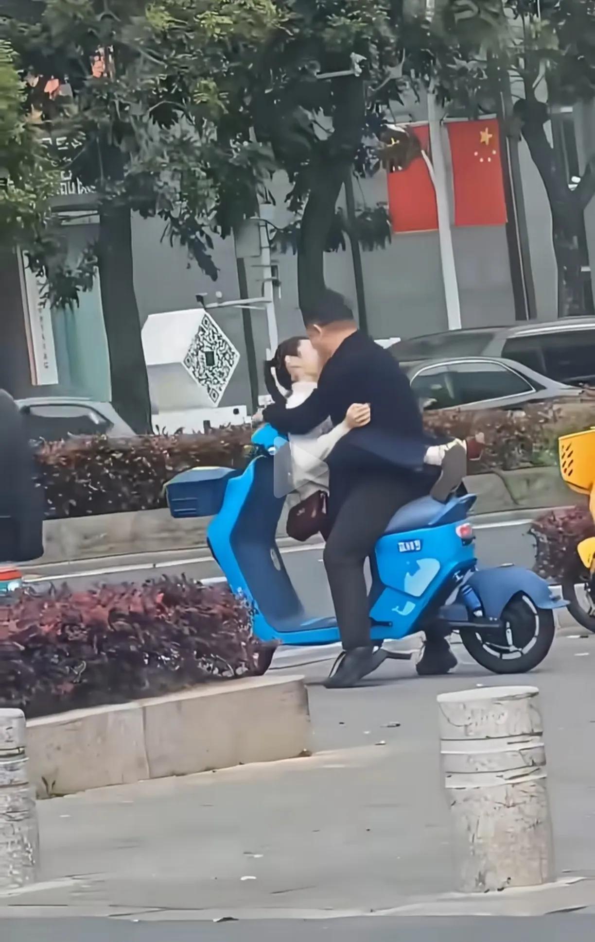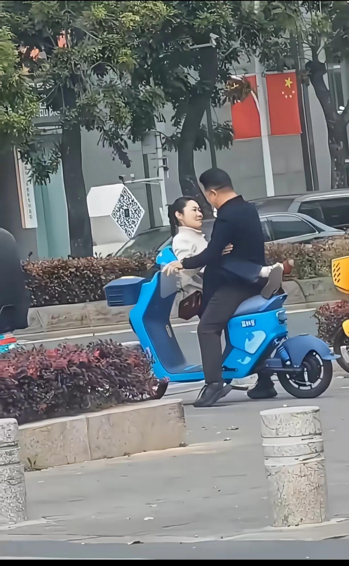 一对男女,坐在路边扫码的电动车上,女人坐前面,搂着男人的脖子,更换各种姿势,也没有调整好坐姿,男人试图骑车走,无奈女人搂脖子太紧,根本没法骑行。 路边行人都没眼看,这款电动车本来只能坐一个人,就算坐俩人,也只能后面勉强加一个人。 这俩人看着也不像小年轻了,大庭广众之下女人还对男人如此撒娇,这个男的还那么有耐心,一看这个男人就是宠妻狂魔。