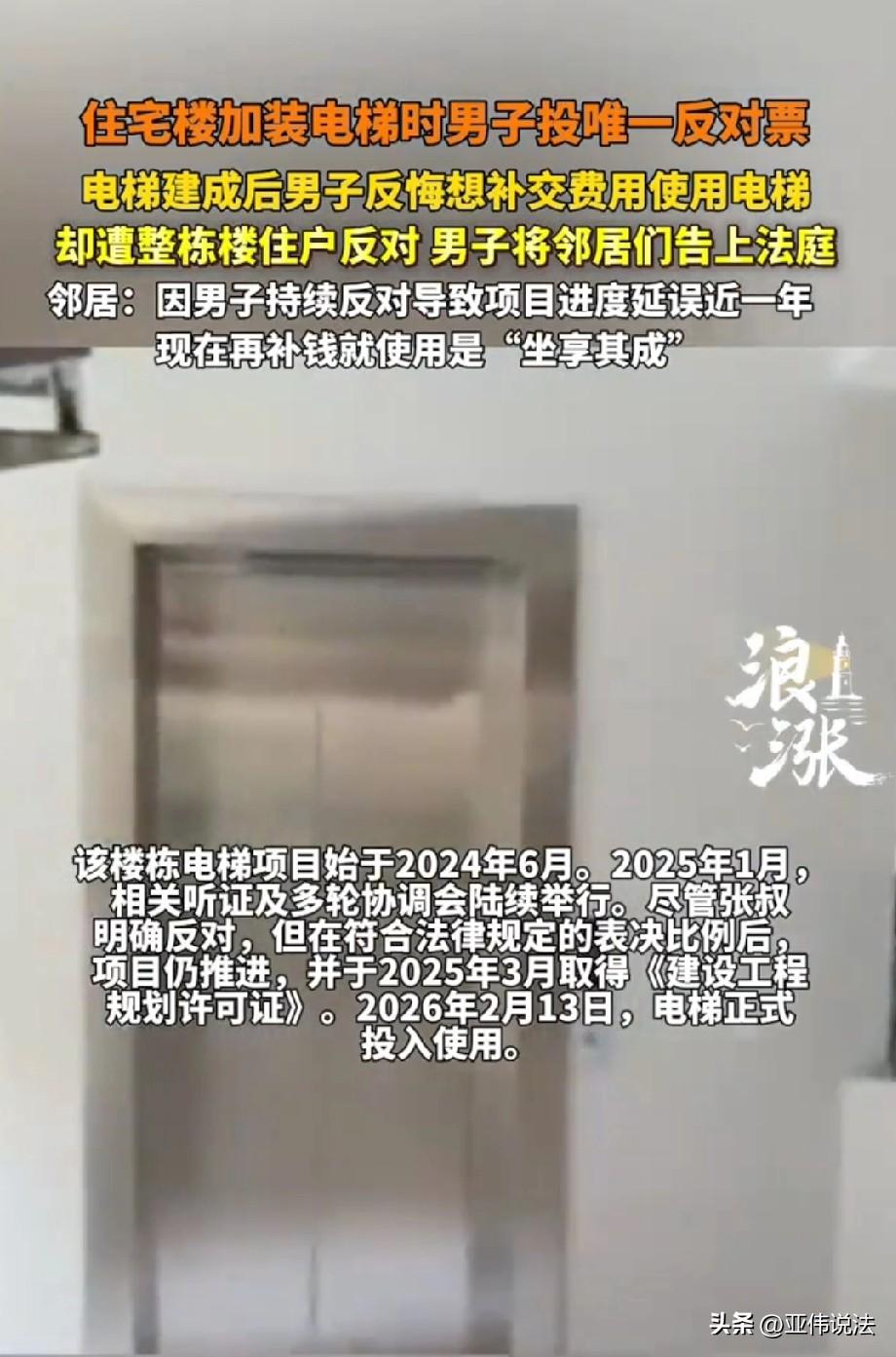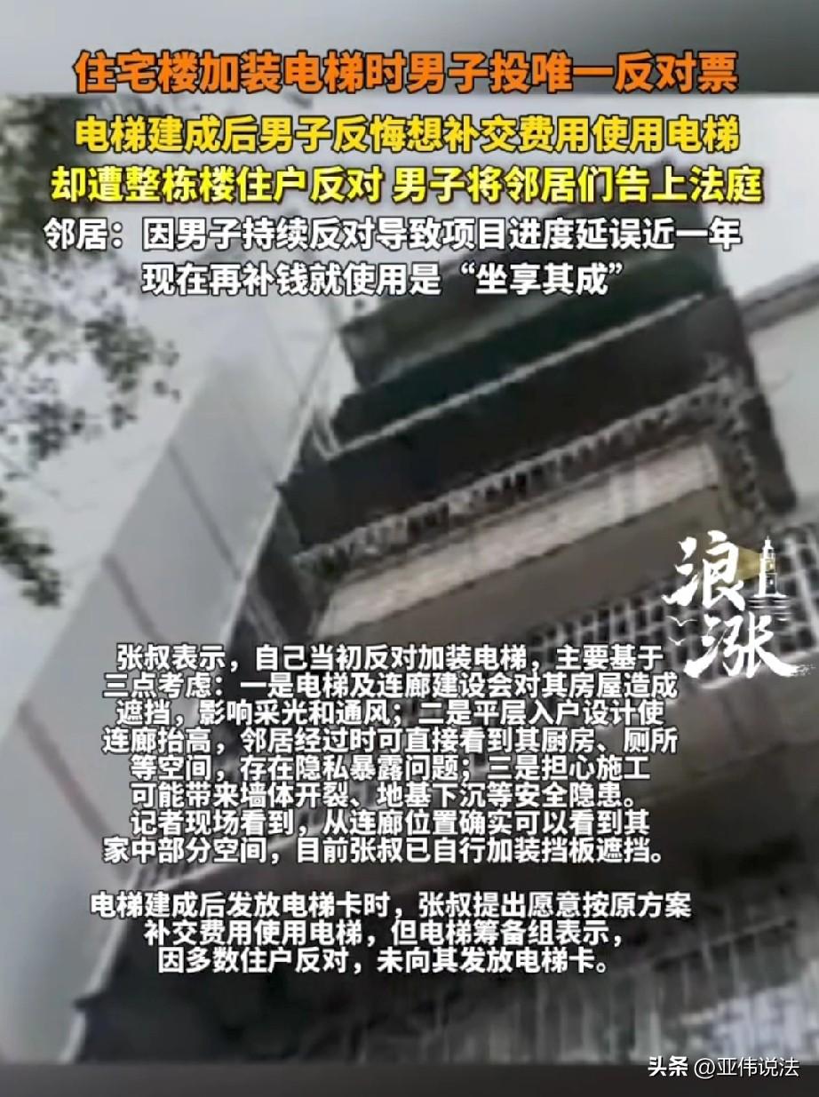 想得美!广东广州,老旧小区没有电梯,上下楼特别不方便,所以大家协商,每家拿出1.9万元加装电梯。整栋楼都举双手赞成,唯独一大爷站出来反对,说装了电梯影响他家采光和隐私。因为他的反对,工期整整耽误了一年多。谁知,等电梯安装好之后,大爷又满眼羡慕,说他愿意补钱使用电梯。哪有这么美的事,其他业主都不同意,大爷竟一气之下将楼上十几家邻居全都告上了法庭。 某小区是老旧小区,楼龄快四十年了,小区环境优雅安静,但愁人的就是没有电梯。 住在这里的,多半是上了年纪的老人,腿脚不方便,楼层稍微高一些,买趟菜回来,爬到三楼就喘的上气不接下气,得扶着栏杆歇半天。 有写老人嫌麻烦,干脆好几天也不了一次楼,天天趴在窗台上看外面的马路,心里头憋屈得慌。 所以,当加装电梯的政策一出来,楼里的住户们就跟过年似的,高兴得不行。 大家伙儿凑在一块儿,商量着怎么申请,怎么凑钱,都想着赶紧把电梯装上,往后日子能松快些。 可谁能想到,整栋楼都热热闹张罗的时候,偏偏住在低层的张叔站出来,投了唯一一张反对票。 张叔心里头盘算着,这电梯要是一装,连廊就建在他家窗户跟前,第一个遭殃的就是采光和通风,以后屋里头整天暗乎乎的。 再一个,设计的是平层入户,连廊抬高后,邻居从他家门口过,一扭头就能直接瞅见他家厨房、厕所,一点隐私性也没有。 还有一点,这楼都三四十年了,地基老、墙体旧,万一施工震出个好歹来,墙裂了、地基沉了,谁担得起这个责任? 就因为这三点,张叔死活不松口。 邻居们轮番上门去劝,跟他解释设计可以调整,隐私可以加挡板,安全也有保障,可张叔就像吃了秤砣一样,铁了心。 就因为他一个人的反对,整个项目就卡住了,反反复复折腾,一拖就是近一年。 不过《民法典》第二百七十八条规定:改建、重建建筑物及其附属设施,应当由专有部分面积占比三分之二以上的业主且人数占比三分之二以上的业主参与表决,并经参与表决专有部分面积四分之三以上且参与表决人数四分之三以上同意 。 加装电梯属建筑物附属设施改建,整栋楼已达法定“双三分之二参与、双四分之三同意”表决比例,并办妥规划许可与施工手续。 秉持着少数服从多数的原则,电梯项目最后还是继续推进了。 2025年3月,手续终于办妥,《规划许可证》拿到手,正式开工,到2026年2月13号,电梯建好,正式启用。 电梯门一开,整栋楼的住户都长舒了一口气,可就在这时候,张叔忽然改了主意。 看着大家伙一按键就能毫不费力的上下楼,自己还得一步一步爬楼梯,他满心羡慕。 于是,他找到电梯筹备组,说愿意按当初定好的方案,补交19000块钱,也想要张电梯卡。 但是,楼上的其他住户都不同意。 当初大家好说歹说,就你死活拦着不让装,害得大伙儿跟着折腾了一年,时间、精力搭进去多少? 现在电梯装好了,你想补点钱就坐享其成,天底下哪有这么便宜的事。 而且,这一年里为了跟他协商,大家请的假、跑的路、生的气,都不是钱能算清楚的。 所以,大伙一致反对,谁也不愿意给他发卡。 张叔心里头也憋屈,他觉得,当初反对是自己的权利,谁也没规定不能投反对票,再说了,现在又不是白用,钱也愿意补,凭什么不让用? 他越想越不是滋味,一气之下,把楼里十多名邻居全告上了法庭。 这一告,矛盾彻底激化了,大家都表示,他要是不撤诉,这事儿就没得商量。 记者后来去现场看过,从连廊的位置确实能瞧见张叔家的一部分,张叔自己已经在窗户上装了挡板。 属地街道办也出面组织过好几次调解,两边都劝,但没有达成一致。 目前,法院已经受理该案,等待进一步调查审理。 从法律角度来看,张叔前期以采光、隐私、安全为由反对,系行使业主异议权。 电梯作为业主共有部分,张叔补交约定出资后,依法享有同等使用权,其他业主不得以其曾反对、延误工期为由,拒绝其付费使用 。 若认为张叔前期阻挠造成损失,可另行索赔,但不能剥夺其基于建筑物区分所有权的共有使用权 。 对此你怎么看?