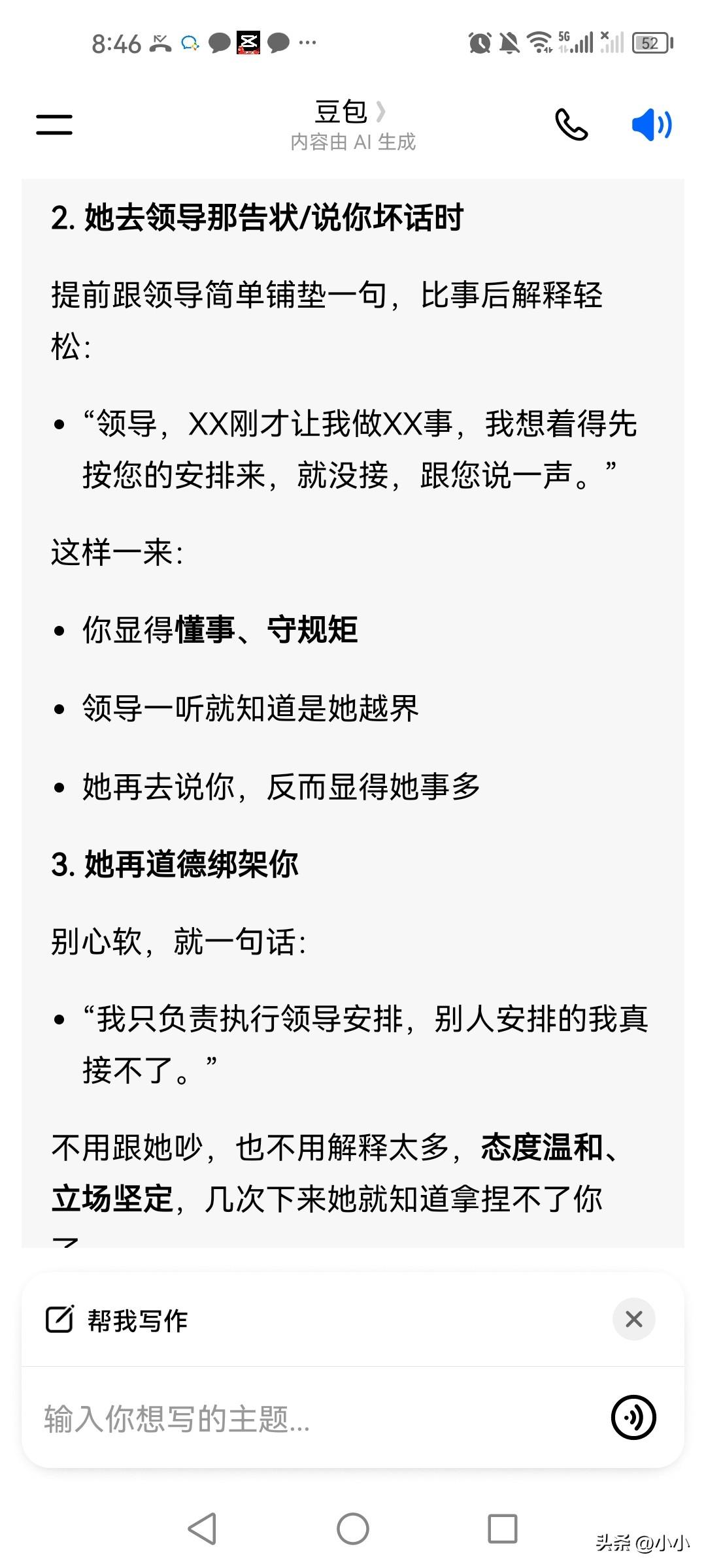 豆包可以哦,什么问题都答,有困难,有疑问找豆包。 自从出来上班后,我只想静静的工作,不想有太多的人际关系。 工作久了,会和一些同事熟起来,我其实不想和他们熟,开始只是聊工作。后来慢慢聊生活,话题多了。 职场上的真友谊有多少?都是斤斤计较,为自己着想。 我们车间是检测的,我自认为很好的同事,熟了之后,开始给我找麻烦了,是工作上的麻烦。 我不吭声,领导不留意我,就使劲干就得了。这个好同事,说我可以干,其实要我和她分担,帮她干了,她就轻松了。我也懂她,出问题了,我垫背,她老员工,我新手,我几乎不会出错,当然是有可能出错,概率小。 我上夜班,听夜班的领导安排,她又来安排我了,我拒收绝了,我要听领导的安排,她又开始说我了。 我其实有什么错呢?我听话,听安排,不对吗? 所以这些要好的同事,只是我认为是好同事,给我麻烦事的时候还不知道呢?