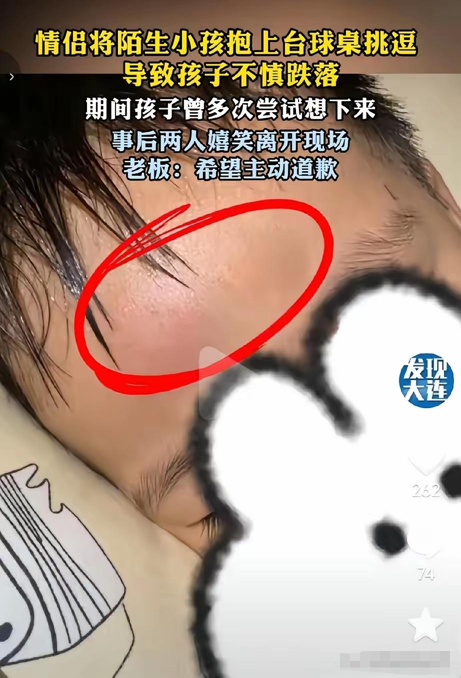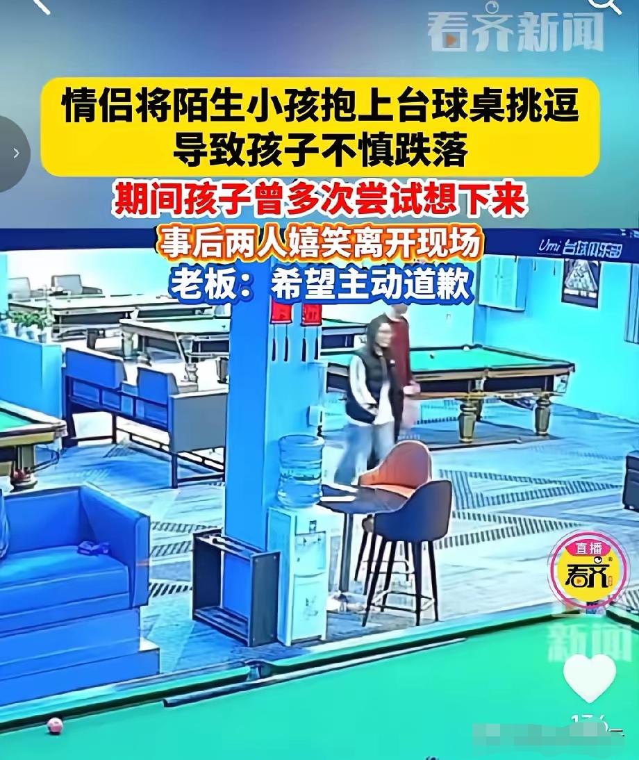 太坏了!台球厅里,一对小情侣看到一个两三岁的小孩独自在那里玩,他们就把孩子抱到台球桌上,孩子看起来很害怕,一直伸手想让他们把他抱下来。 这件事曝光之后,立刻引起了网友的反感。台球厅人员杂乱,没有儿童防护设施,本身就不适合低龄孩子停留。两三岁的幼儿平衡能力差,站在高处极易跌落,根本没有自我保护的能力。 很多人不解,孩子为什么会独自待在这里。现实里不少家长监护意识薄弱,总觉得短时间离开没关系。他们忽略了公共场所的未知风险,也低估了陌生人不当举动带来的伤害。年幼孩子分辨不了好坏,害怕了只能本能求救,一旦脱离看护,危险随时会发生。 这两个人的行为,算不上玩笑。画面中的孩子明显惶恐不安,反复伸手想要下来。成年人最基本的修养,就是看懂孩子的恐惧,立刻停下不合适的举动,而不是只顾自己消遣。 这件事暴露了一部分年轻人共情能力不足、缺少公德边界的问题。分不清娱乐和冒犯的区别,不在意自己的行为带来的后果。从安全角度来说,台球桌边角坚硬、高度偏高,孩子一旦摔倒,很容易受伤。从心理层面来讲,突然被陌生人放在高处,会给孩子留下长久的心理阴影,破坏孩子的安全感。 对待弱小孩子的态度,最能看清一个人的人品。善良从来不是空话,不把快乐建立在别人的害怕之上,是做人最基础的底线。 现场还有不少成年人围观,却没有人上前制止。这种冷漠,也是一种纵容。保护未成年人,不只是家长的责任,每个普通人看到孩子被欺负,都应该及时伸手帮忙。 所有家长都要引以为戒,不要带低龄宝宝进入台球厅这类不适宜的场所。出门在外,视线一刻都不能离开孩子,侥幸心理往往会酿成意外。 现在还有一种不好的现象,有人专门拍孩子窘迫的画面博取流量。靠消费别人的不安赚钱,早已丢掉了底线,理应被大家抵制。 我们不恶意揣测两人的初衷,但不管是什么原因,吓到年幼孩子就是不妥。真正的相处,要有分寸,要有善意,更要有对孩童的呵护。 整件事折射出两个现实问题,一部分人做事没有分寸、缺乏同理心,一部分家长疏于看管、安全意识不足。想要减少这类伤害,既要提升个人素养,也要强化监护责任,让社会一起守护身边的小朋友。 各位读者你们怎么看?欢迎在评论区讨论