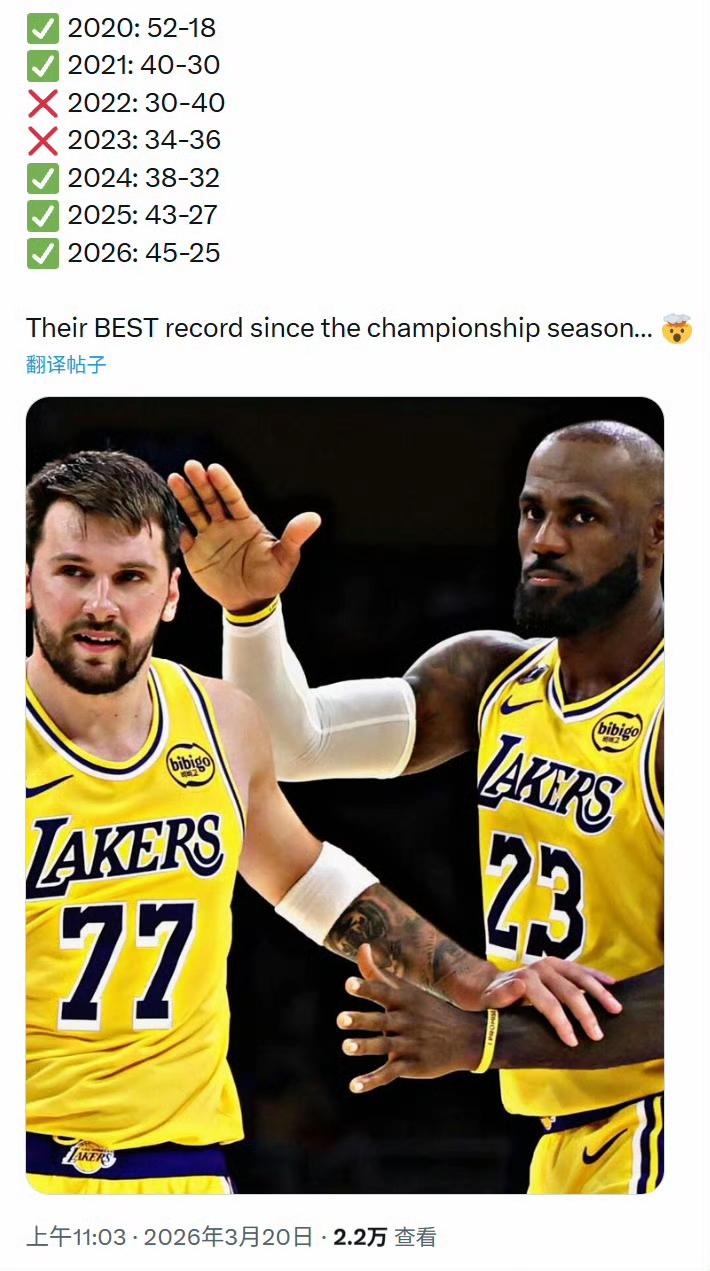 湖人是本赛季唯一一支有三名球员的场均得分超过20的球队:东契奇32.9分,里夫斯23.8分,詹姆斯21.1分。 湖人本赛季70场比赛45胜25负,是2019-20赛季以来的最佳战绩,比上赛季同期多赢两场球。