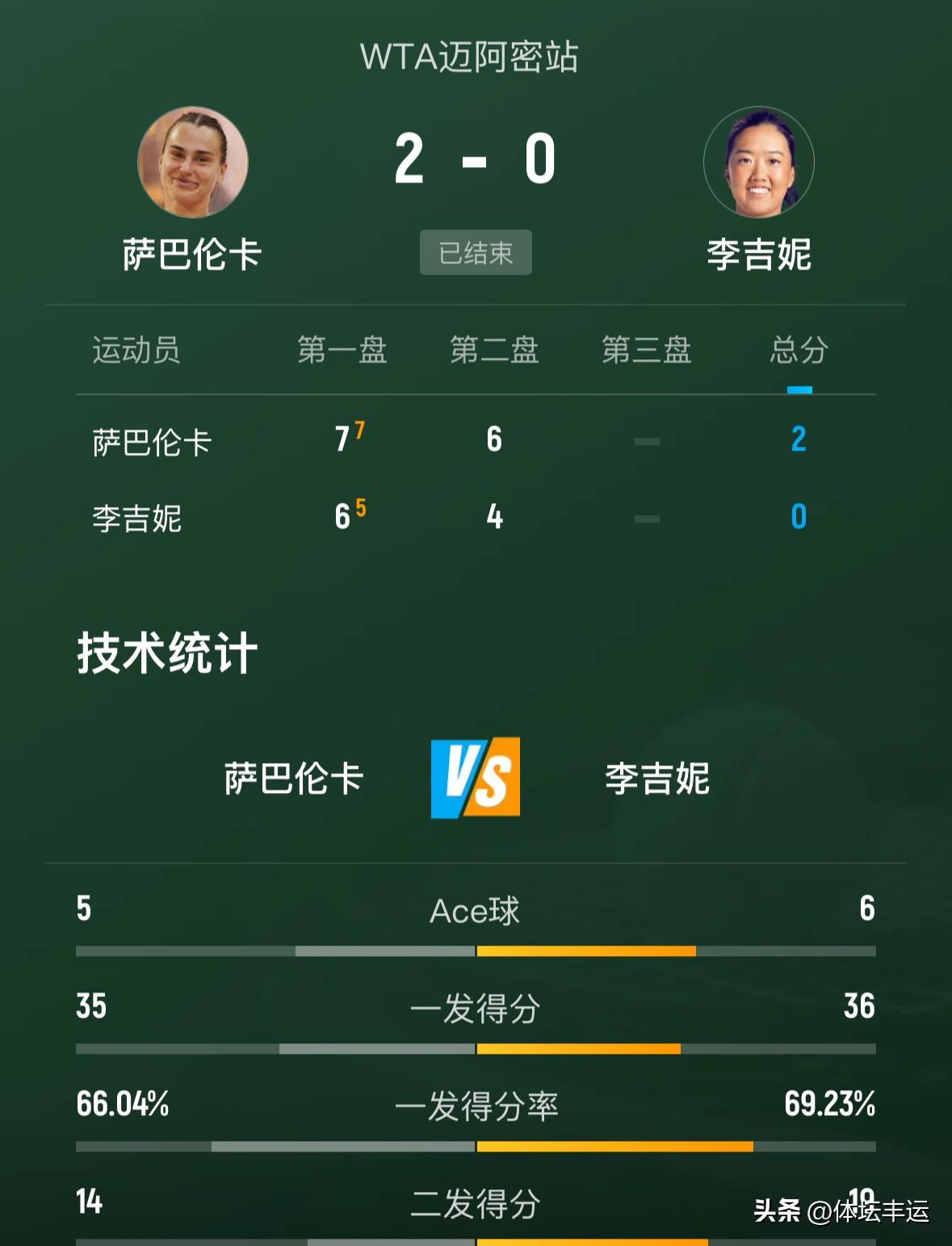 萨巴伦卡战胜李吉妮晋级女单32强🔥🔥 刚刚🔚的迈阿密女单次轮比赛,头号种子白俄罗斯萨巴伦卡7-6(5)、6-4战胜美国李吉妮晋级女单32强! 这场比赛可谓是精彩纷呈。首盘比赛,萨巴伦卡和李吉妮就展开了激烈的争夺。李吉妮毫不畏惧头号种子的威名,在场上积极进攻,给萨巴伦卡制造了不小的麻烦。双方比分一直紧咬,比赛进入抢七。在抢七局中,萨巴伦卡凭借着出色的发球和稳定的发挥,以7-5艰难拿下首盘。 进入第二盘,萨巴伦卡迅速调整状态,加强了进攻的力度。她的发球势大力沉,让李吉妮难以招架。而在底线的对攻中,萨巴伦卡也展现出了强大的实力,不断地调动李吉妮的位置,寻找进攻机会。李吉妮虽然也在努力抵抗,但萨巴伦卡的状态实在太好。最终,萨巴伦卡以6-4再下一城,成功晋级女单32强。