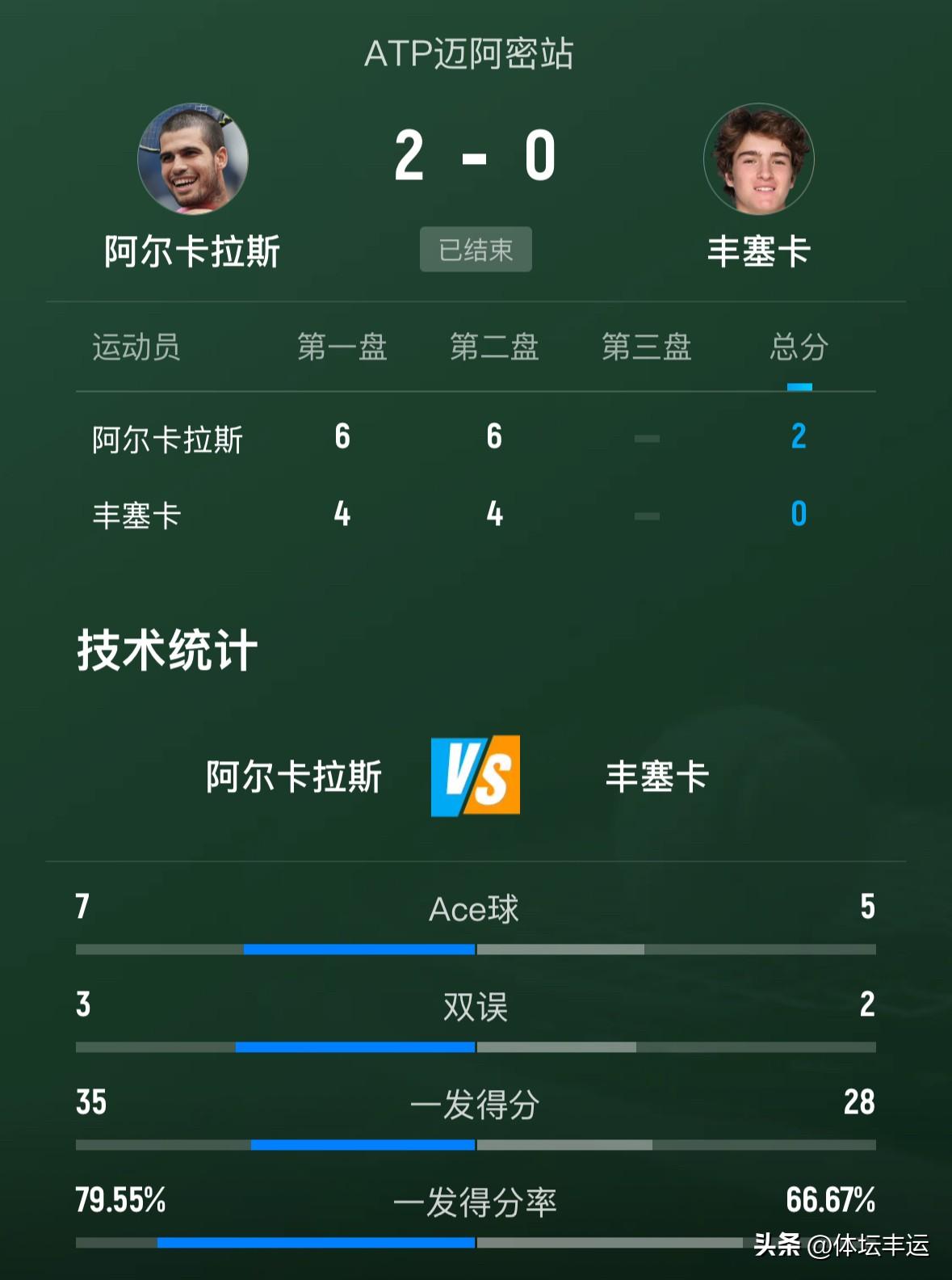 阿尔卡拉斯战胜丰塞卡晋级男单32强🔥🔥 刚刚🔚的迈阿密男单次轮比赛,首轮轮空的头号种子阿尔卡拉斯6-4、6-4战胜巴西小将丰塞卡晋级! 阿尔卡拉斯在比赛中展现出了顶尖选手的实力和风采。面对年轻有冲劲的巴西小将丰塞卡,他从一开始就迅速进入状态。在第一盘比赛里,阿尔卡拉斯凭借着出色的发球和灵活的移动,不断给丰塞卡施压。他的底线抽球精准而有力,让对手很难找到反击的机会。尽管丰塞卡也有几次精彩的回球,但阿尔卡拉斯凭借着丰富的经验和稳定的发挥,以6 - 4先下一城。 进入第二盘,丰塞卡试图改变战术,加强了进攻的力度。然而,阿尔卡拉斯应对自如,他巧妙地化解了对手的攻势,并且抓住机会展开反击。每一次得分,他都展现出自信的姿态。最终,阿尔卡拉斯再次以6 - 4拿下第二盘,顺利晋级下一轮。
