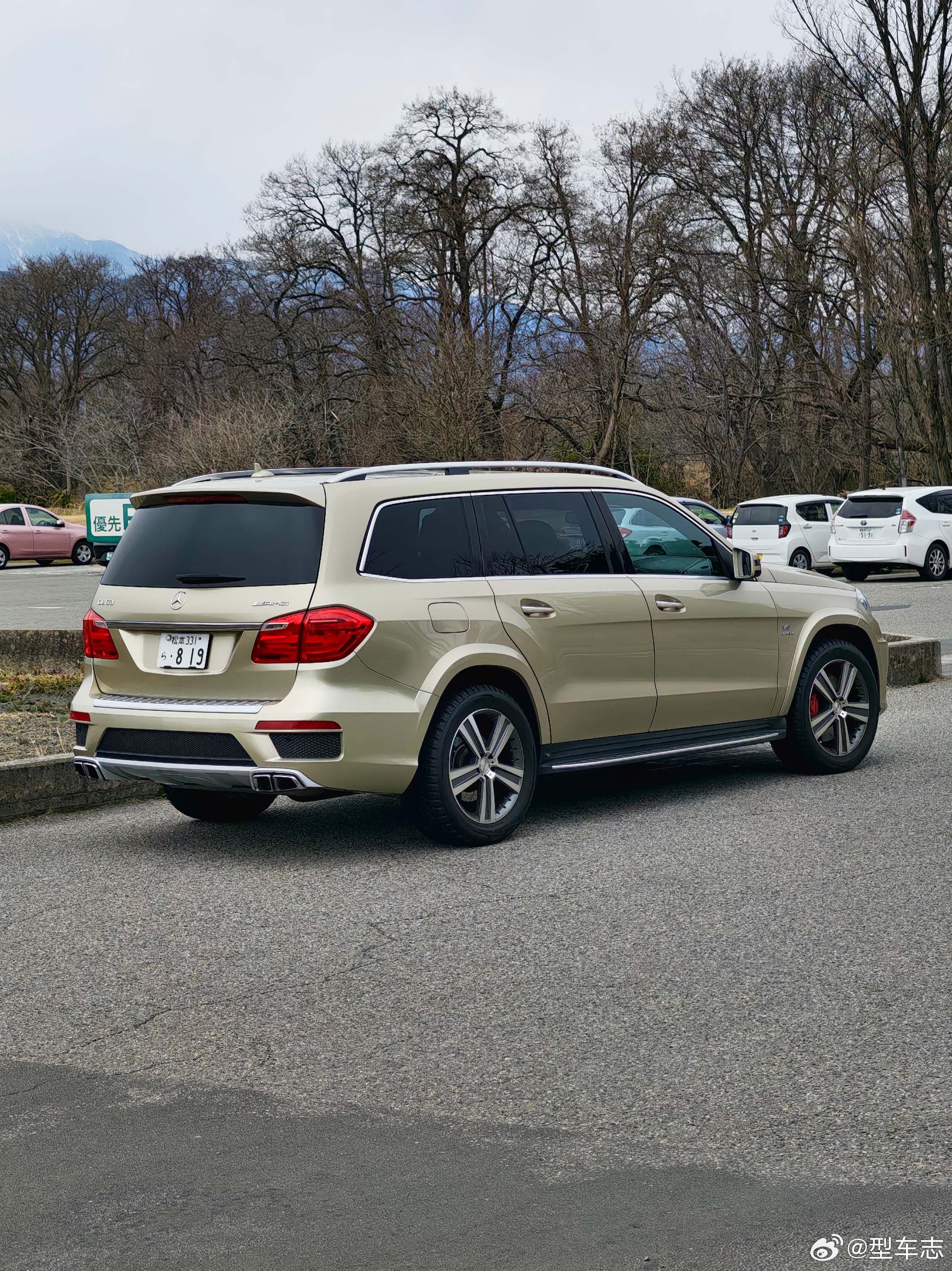型车街拍偶遇GL63 AMG,属于第二代GL(X166),还没改名叫GLS。5.5L双涡轮V8,七座,轴距3米多的全尺寸性能SUV,当年这种组合独此一家。一身金色车漆,配色很有那个年代的味道,现在AMG已经很少见了。 日本·大王わさび農園