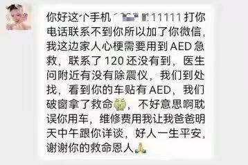 车窗被陌生人砸破,取走AED,车主回应:是留给急需的人用的,人命最重要。 救人一命胜造七级浮屠,车主李先生践行了这一古语。在今年二月份。他花3万块钱买了一个AED,放在自己的车里,并贴上标识。车内配有AED,情况紧急可破窗。 没想到刚买了三天就派上用处了,3月10号这一天,他看到手机很多未接信息。 看到短信有一女子发给他说:我的父亲心梗需要AED发现你车上有,就破窗用了。后续我们会赔偿你的费用,谢谢。 心脏骤停超过4分钟,对大脑的损伤不可逆。李先生真的救了陌生人一家。