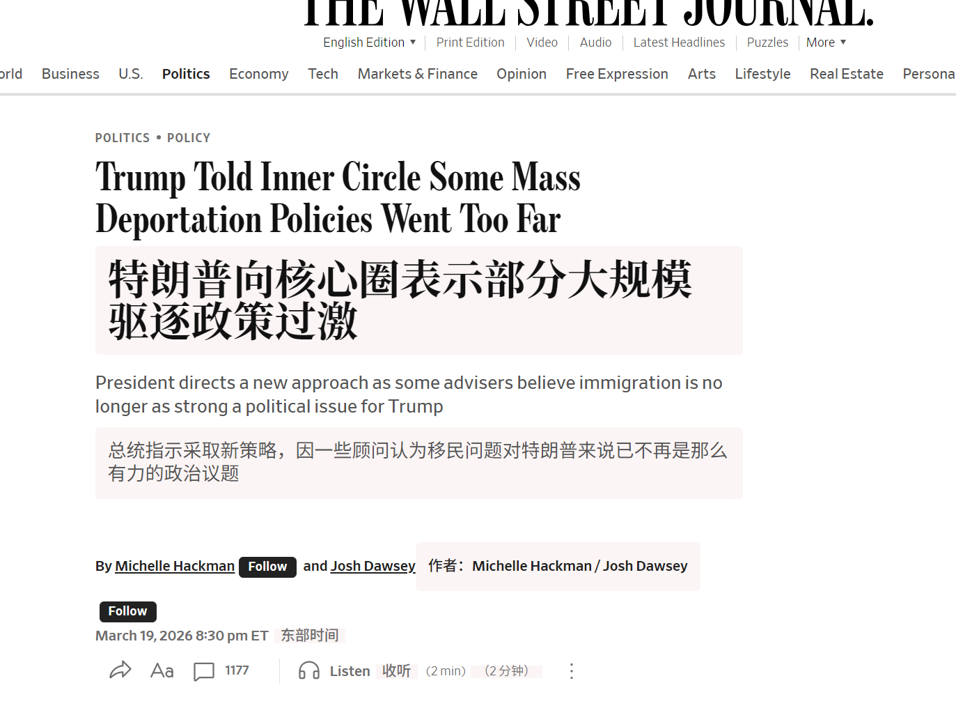 🔻据《华尔街日报》报道,特朗普向核心圈子表示,“某些大规模驱逐政策做得太过分了