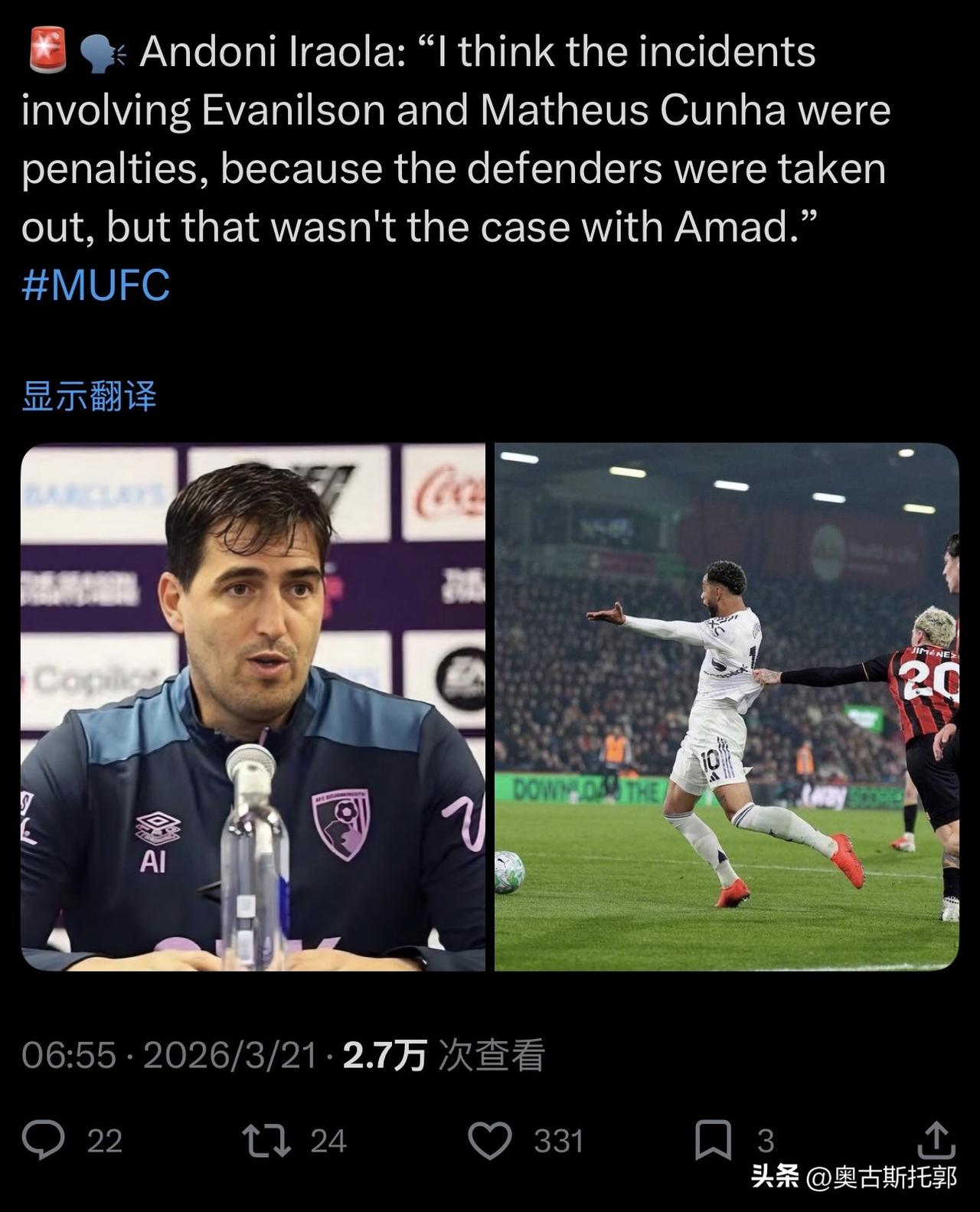 我一直很奇怪“点球联”这个绰号,平心而论,曼联一直都不是联赛里被裁判偏袒的球队。 ……………………………………………………………… 🗣️安多尼·伊拉奥拉:“我认为埃瓦尼尔森和马特乌斯·库尼亚的犯规是点球,因为后卫放倒了他,但阿马德的情况并非如此。”