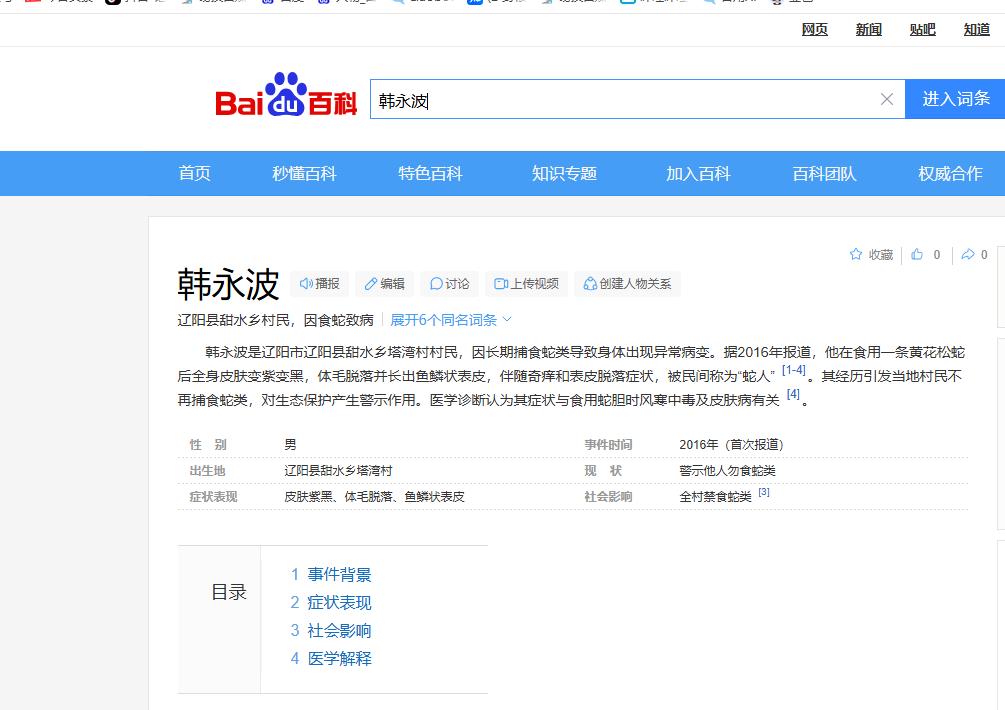 吃蛇太多变蛇人?2003年辽宁省,村民韩永波有个特殊的爱好——爱吃蛇,不仅顿顿有蛇肉,还必须是新鲜现杀的,村里人都说他胆子大,可这个习惯他保持这么多年,也没出过啥问题,直到一条黄花松蛇的出现,他皮肤开始逐渐变紫变黑,身上还长出鳞片...... 要想搞清楚韩永波到底经历了什么,还得从他的一项特殊爱好说起。 他祖上就是靠山吃山,对抓各种长条爬行动物非常在行。在他眼里,那些在草丛里乱窜的无毒蛇比如乌梢蛇之类的,根本不是什么可怕的野生动物,而是不可多得的下酒菜。 几十年来,韩永波只要抓到猎物,通常都是当场扒皮拆骨,连里面的苦胆也经常一口吃下去。 这种盲目的自信让韩永波觉得自己百毒不侵,直到2003年冬天的一次意外,彻底打碎了他的侥幸心理。 那天他在邻居家喝得正高兴,恰好碰到一条一米多长的黄花松蛇在鸡窝附近转悠。 借着酒劲他三下五除二就把这条蛇变成了盘中餐,像往常一样连肉带胆送进了肚子。他以为这只是一顿普通的野味,却不知道这个举动让自己陷入争议之中。 没过几天,韩永波的身体开始出现不适。 刚开始他只是觉得全身上下刺挠得慌,本以为是普通的虫子咬了,抹点药就能扛过去。可是情况恶化得让人绝望,他的皮肤一天比一天紫,最后甚至变成了吓人的黑褐色。 更恐怖的是,那些黑紫色的皮肤开始增厚变硬,形成了一块块带着油光的硬痂。只要他稍微动弹一下,那些硬皮就像头皮屑一样哗哗往下掉。 伴随而来的还有刺骨的寒冷和剧烈的瘙痒,哪怕外面是三伏天,他也在屋里冻得上下牙打架,身上的毛发也掉得惨不忍睹。 面对这种诡异的状况,乡亲们纷纷躲着他走,私下里都说他这是嘴太馋遭了报应。 韩永波一家人彻底慌了神,他们不去大医院挂号,反而花冤枉钱去找那些会“通神”的半仙来家里折腾。 结果钱打了水漂,人的情况却眼看着越来越糟,整个家庭都被绝望的情绪笼罩着。 眼看着人快不行了,村镇的干部实在看不下去,赶紧介入帮他联系了辽阳市里的大夫。 一位叫付萌露的中医专家接手了这个棘手的烂摊子,经过仔细问诊,这起闹得人心惶惶的怪病终于迎来了科学的解释。 付医生一眼就看出这哪里是什么神秘力量作祟,完全是医学上的综合性皮肤病。 原来韩永波常年劳作,身体里早就潜伏着严重的风湿和寒气。 而他吃下去的那条黄花松蛇也就是动物学上的白条锦蛇,虽然本身没有毒液,但野生动物体内通常携带着大量的寄生虫和不明病原体。 生吞蛇胆加上没有彻底煮熟的蛇肉,直接引发了严重的过敏和中毒反应。内有风湿,外有毒素,两股邪气在体内一撞,这才会让皮肤产生极其严重的病变反应。 找准了病根,付医生立刻安排了系统的中医治疗方案。不搞虚头巴脑的偏方,而是用最扎实的针灸和拔罐来对付体内的顽疾。 医生专门挑了大椎、肾俞这些关键穴位进行疏通,配合放血拔罐,硬是一点点把困在韩永波体内的湿气和毒素逼了出来。 经过一个多月的治疗,奇迹真的发生了。 韩永波身上那些吓人的硬壳开始软化脱落,原本掉光的头发也重新冒出了毛茬。虽然皮肤上留下了永远洗不掉的深色印记,但好歹是从鬼门关里捡回了一条命。 经此一劫,他再也不敢碰任何野生动物了,老老实实当个普通的庄稼汉,还经常拿自己的惨痛经历去劝阻那些嘴馋的熟人。 很多人总觉得野生动物大补,为了所谓的面子或者养生去尝鲜,这纯粹是拿自己的命在赌博。 大自然里的生物链有着自己的规矩,打破规矩强行把风险吃进肚子里,最终吃亏的只能是人类自己。相信科学,管住自己的嘴,才是最顶级的养生之道。 看到这里,你觉得那些热衷于吃野味来“大补”的人,到底是出于什么心理呢?欢迎到评论区讨论。