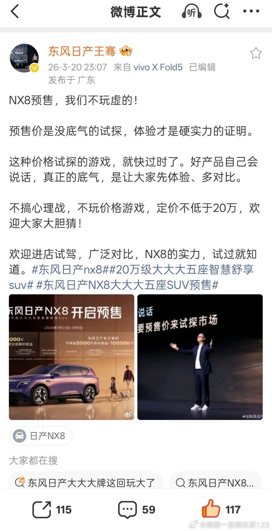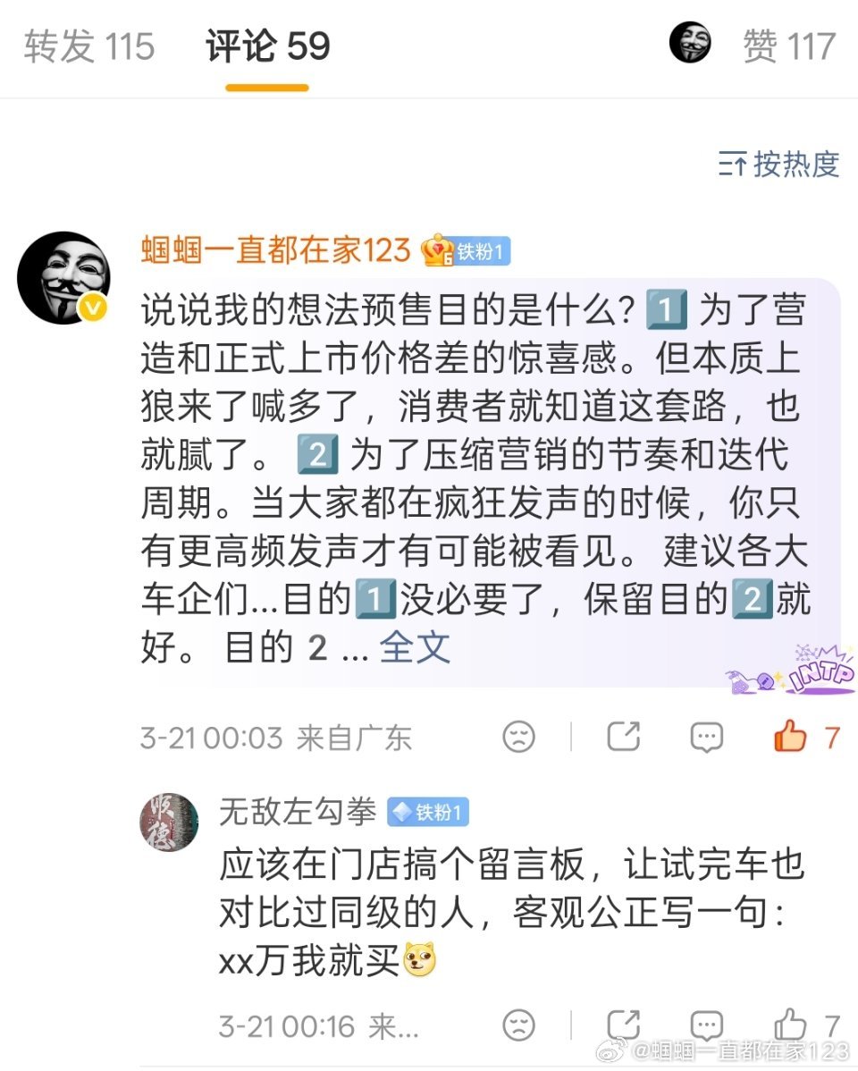 车企有没有必要公布预售价 发起个小tag,说说自己想法,碰巧最近或主动或被动刷到两个消息。【图1】一个是王骞总因为NX8发布会的澄清微博。【图2】一个是发的个人观感解读。我呢,跟风简单回复了微博写了我初步的想法。【图3】在这里呢也忙里偷闲说说自己的浅显理解。1️⃣ 通过公布预售vs实际上市,营造差价的惊喜感已经是“狼来了”消费者看的发布会太多了,对于预售价的感官上...就觉得没意义,反正都是假的,只会觉得预售价这东西没啥参考意义,狼来了听多了就是脱裤子放屁。2️⃣ 预售价本质上只是营销节奏的极致压缩带来的一个小产物...以前其实车企哪有什么技术发布会,哪有什么预售两周后快速上市发布会...直到“卷王”出现,有的甚至一款车开三场发布会,这可还行??3️⃣ 预售价作为一场低成本市场调研很多时候反倒会成为一种干扰项有多少人会奔着预售价去看车呢?想看车的自然会去看,不想看车的也并不会因为你的预售价去看。因此呢...少点套路,多点真诚,多多看车,货比三家。没有预售价,只有一锤子买卖板上钉钉的上市价格对整个汽车营销环境也挺好的。阿祖们都收收手吧,汽车行业已经太卷啦各位觉得预售价还有必要么?大v聊车