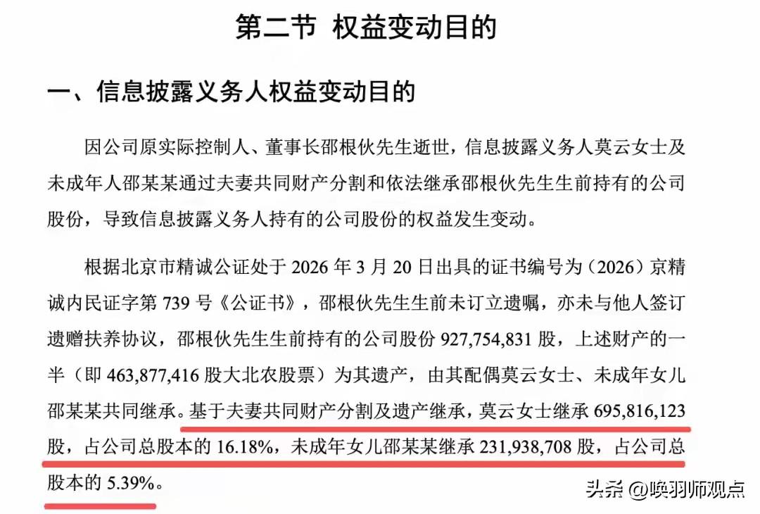 9亿股票归未成年女儿!大北农创始人猝然离世,未留遗嘱留下多少悬念? 3月20日晚间,大北农公告披露,原董事长邵根伙因病逝世,未订立遗嘱。其生前持有的9.28亿股公司股票,经法定继承后,未成年女儿继承2.32亿股,市值约9.46亿元。因女儿未成年,所有股东权利由其母亲莫云代为行使,莫云成为新的实际控制人。 专家解读: 家族企业治理专家指出,邵根伙“未留遗嘱”暴露传承规划盲区。创始人个人意志与企业命运深度绑定,突然离世若无清晰安排,企业可能面临治理真空。未成年继承人的“监护期”,可能成为战略决策的变量。 反思: 家族企业传承需提前布局:股权架构、接班人培养、法律文件完备缺一不可。数据显示,仅不到20%的民企有清晰传承规划。 历史关联: A股历史上,创始人突然离世引发企业动荡的案例屡见不鲜,家族内斗、控制权争夺往往导致市值蒸发。 结语: 创造财富是能力,规划传承是远见。唯有制度化的安排,才能让基业真正长青。大北农事件 齐齐哈尔大北农 大东农 通辽大北农饲料 大北农面试 北牧大农牧 通辽大北农服务 大北农科技奖 大北农面试题 广州大农 江西大佑农 广州华农大 邵老苗