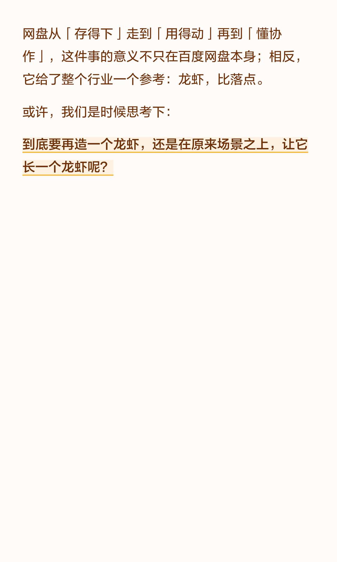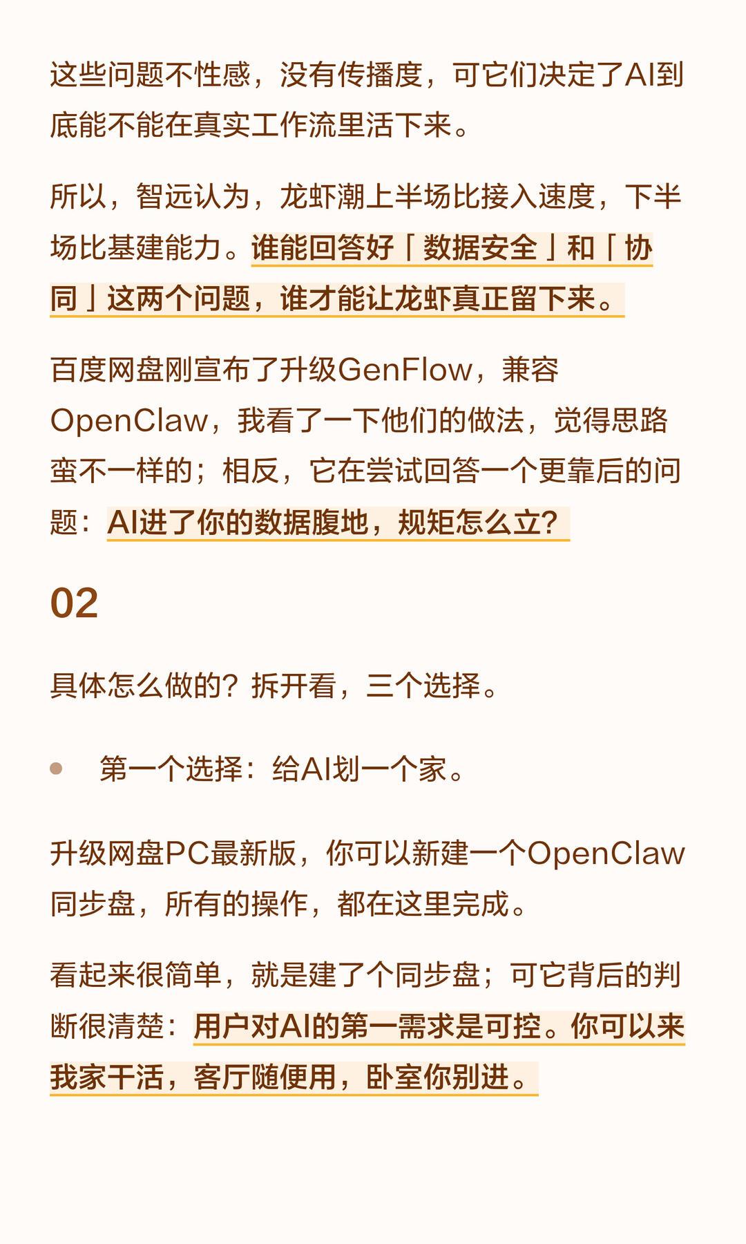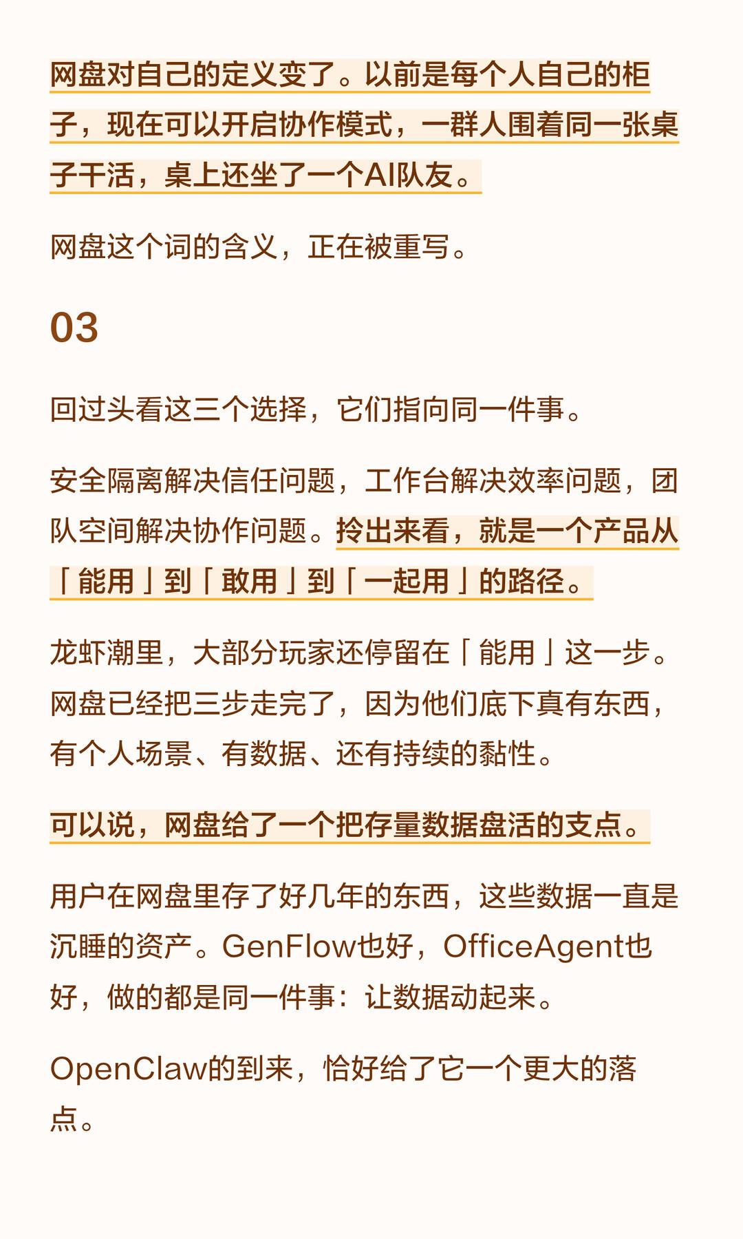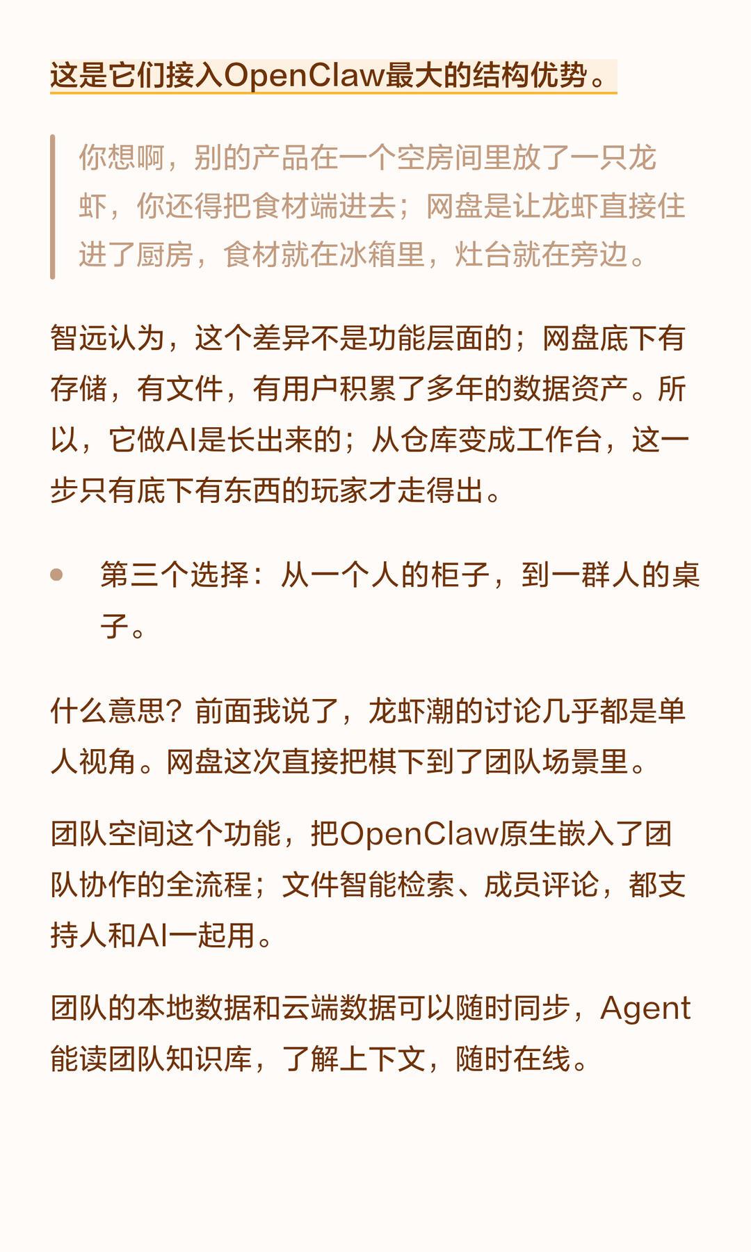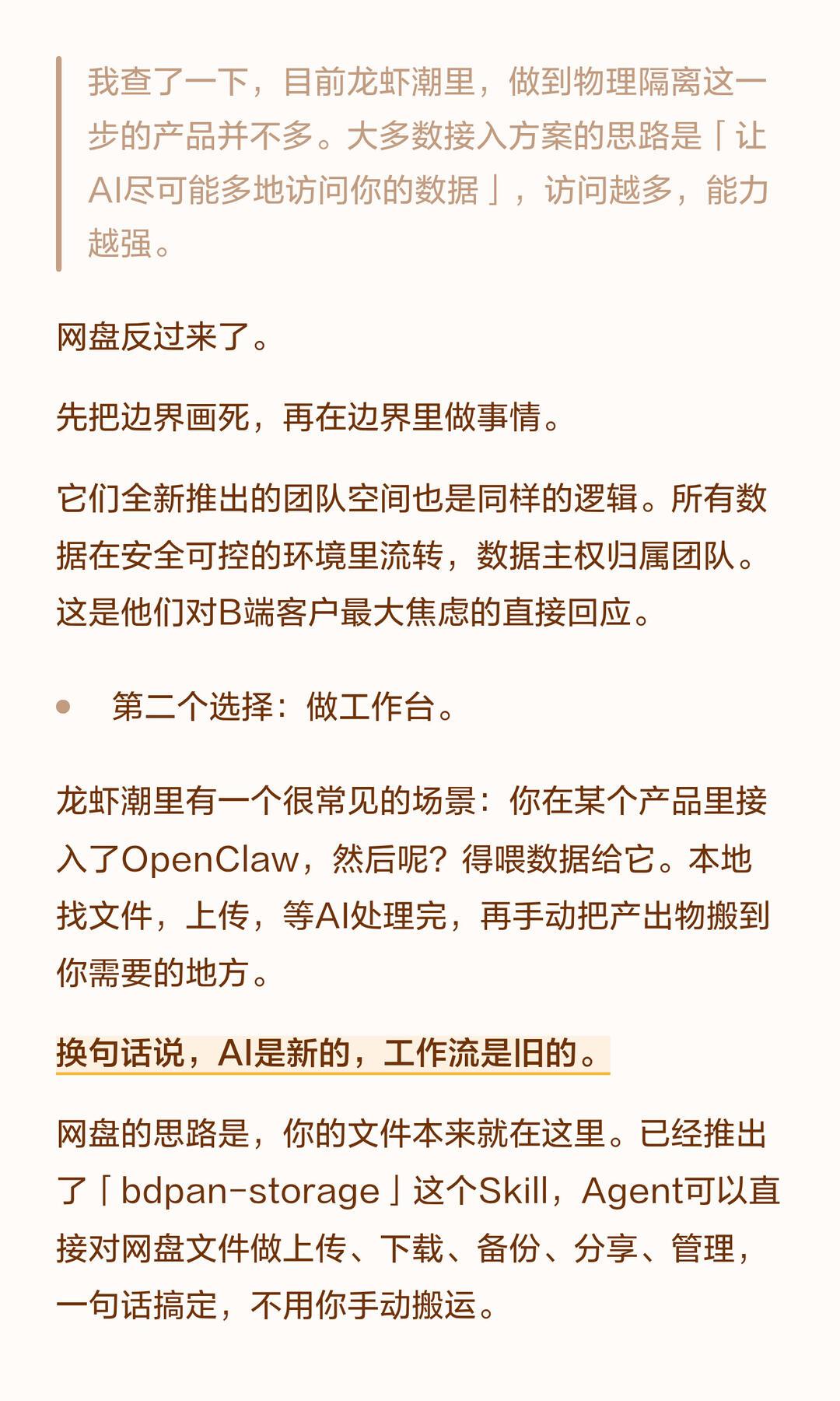 我看了下,网盘也接入了小龙虾,不过它的思路跟别人不太一样。不是抢着接,是先把池子建好,再把龙虾放进去。安全、协同、工作台,三件事一起做了。这篇聊聊我的看法。