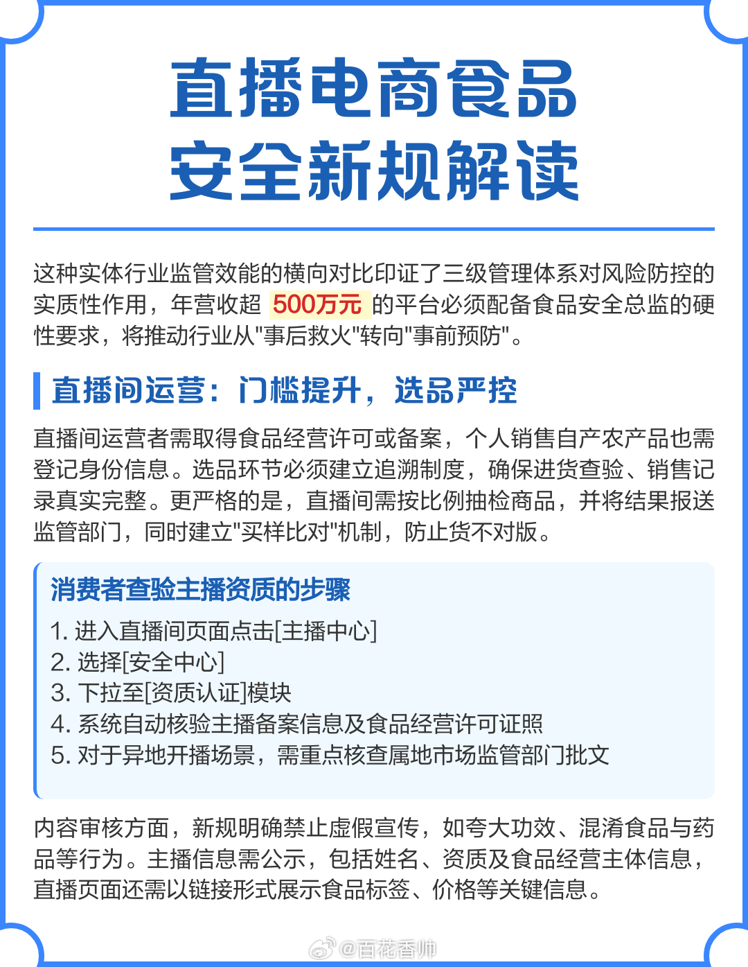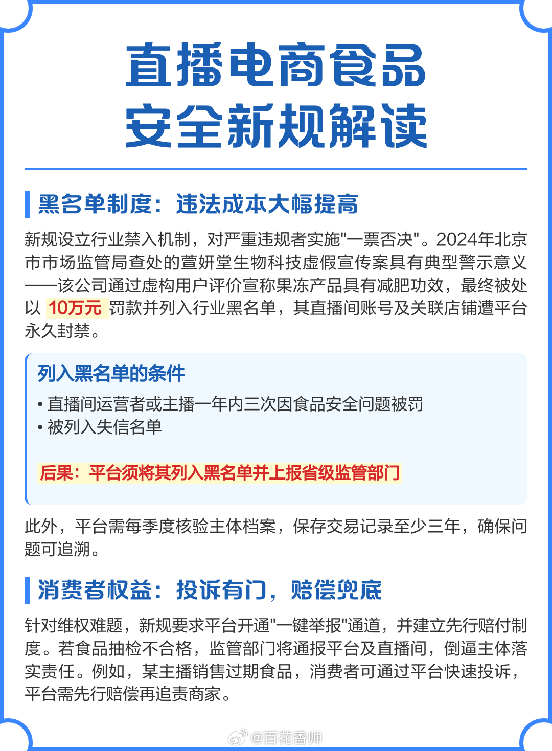 直播间禁售13类食品新规今起实施新规来的太及时了,以往直播电商食品安全问题频发,平台甩锅、主播给钱张嘴就乱吹,消费者维权难。新规将各方纳入监管,压实平台主体责任,明确禁售食品和禁播行为,引入流量监管,构建全链条保护体系。这是对直播乱象的一记重拳,让平台和主播不敢再心存侥幸,切实保障了群众“舌尖上的安全”,为直播电商行业健康发展保驾护航。