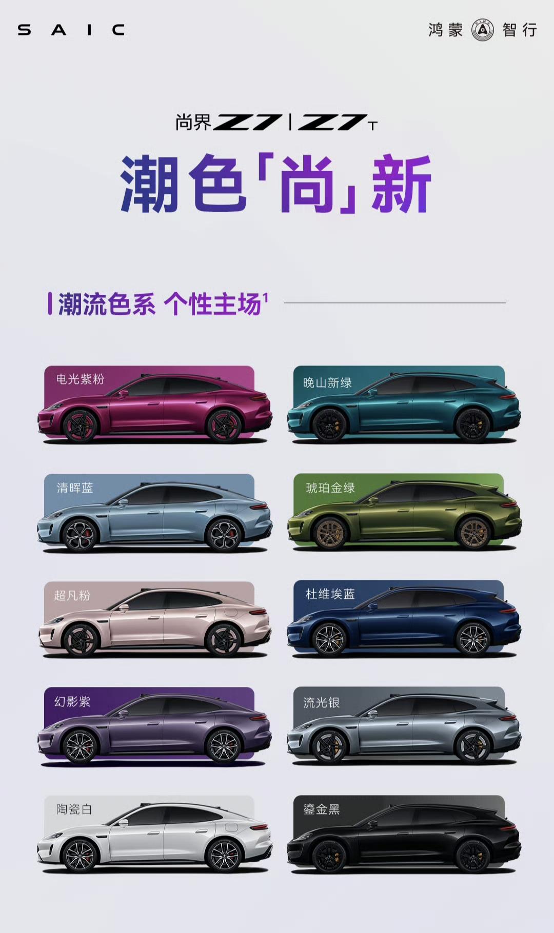 尚界Z7一下出了10款车色,选择很多,不必后期再去贴彩色膜了,还搭配了8种轮毂样式,其实是5种造型,再搭配不同颜色和材质,组合成8种。有19英寸和20英寸两种规格可选。 尚界Z9对外观下了很大的功夫,轿跑车身造型,还有尚界Z7T的猎装车型,首先从颜值俘获广大消费者。 车色除了常规的银、白、黑,也给出了新潮的超凡粉(图1)幻影紫(图2)和电光紫粉(图3),女士会更偏爱。 喜欢个性的男士或许更喜欢琥珀金绿(图4)晚山新绿(图5)这样特别调配的自然系车色。 尚界Z7低趴修长的造型搭配各种车色和轮毂,选择很多,看看你会怎么组合起来更有个性?【来自懂车帝车友圈】