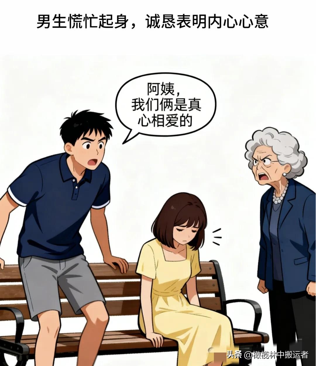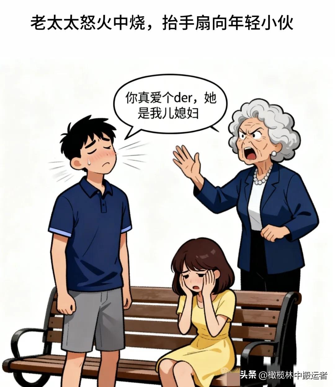 趣味漫画:老太太路过喊:不要脸。男怒:你谁啊,说谁呢。女生突然喊:妈!男忙说:阿姨,我们真心相爱。老太太扇他:她是我儿媳妇!