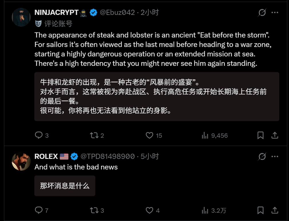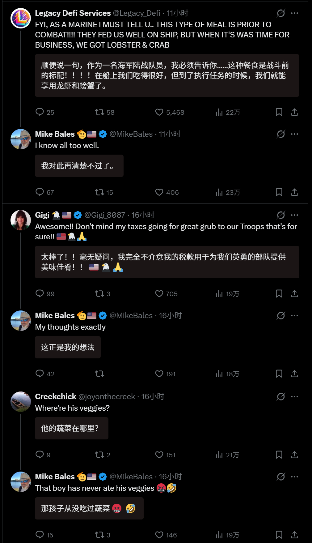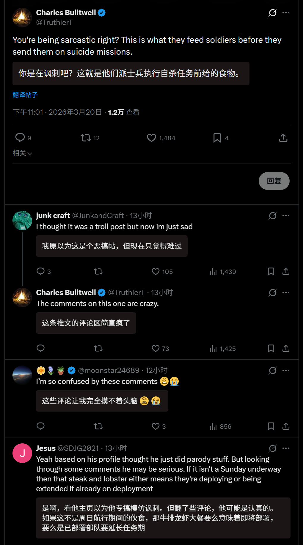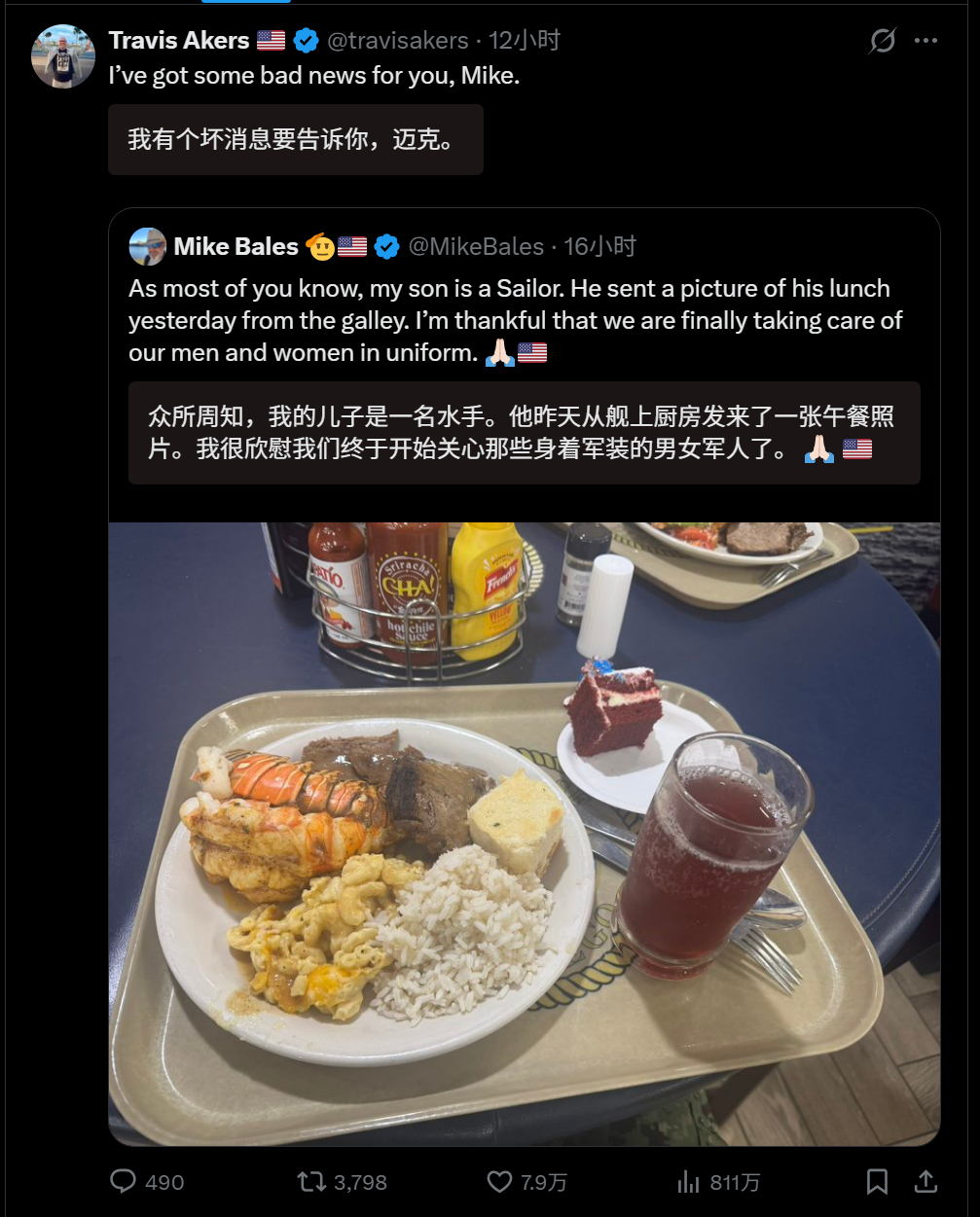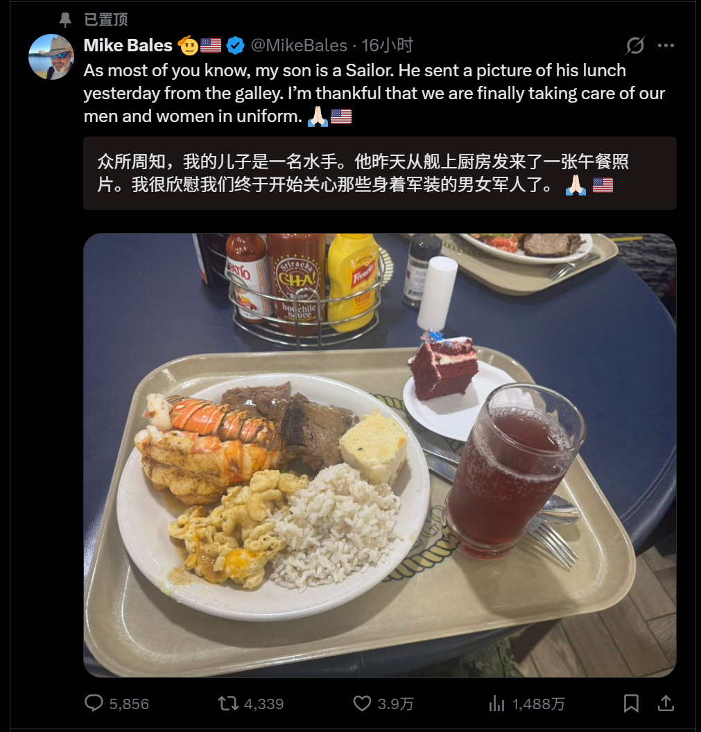 🔻网友分享:丸辣。🔻一个美国MAGA帐号分享:“众所周知,我的儿子是一名水手。他昨天从舰上厨房发来了一张午餐照片。我很欣慰我们终于开始关心那些身着军装的男女军人了。”🔻龙虾与牛排餐,圣迭戈海军基地的餐盘。🔻接近1500万阅读量,美国人现在都搞不懂这个人是不是在串,至少这张图以前没见别人发过。🔻圣迭戈海军基地,根据最近的报道(2026年3月20日消息),拳师号两栖攻击舰及其编队(包括“康斯托克”号船坞登陆舰、“波特兰”号两栖船坞运输舰,以及搭载的约2500名海军陆战队员,隶属第11海军陆战队远征部队)已从位于加利福尼亚州的圣迭戈海军基地启程,前往中东地区增援。这次出发比原计划提前约三周,以响应美军在中东增强部署的需求。🔻冲滩?以色列全国多地遭导弹袭击伊朗威胁将毁灭性打击美以邪恶官员海外新鲜事中东现场直击
