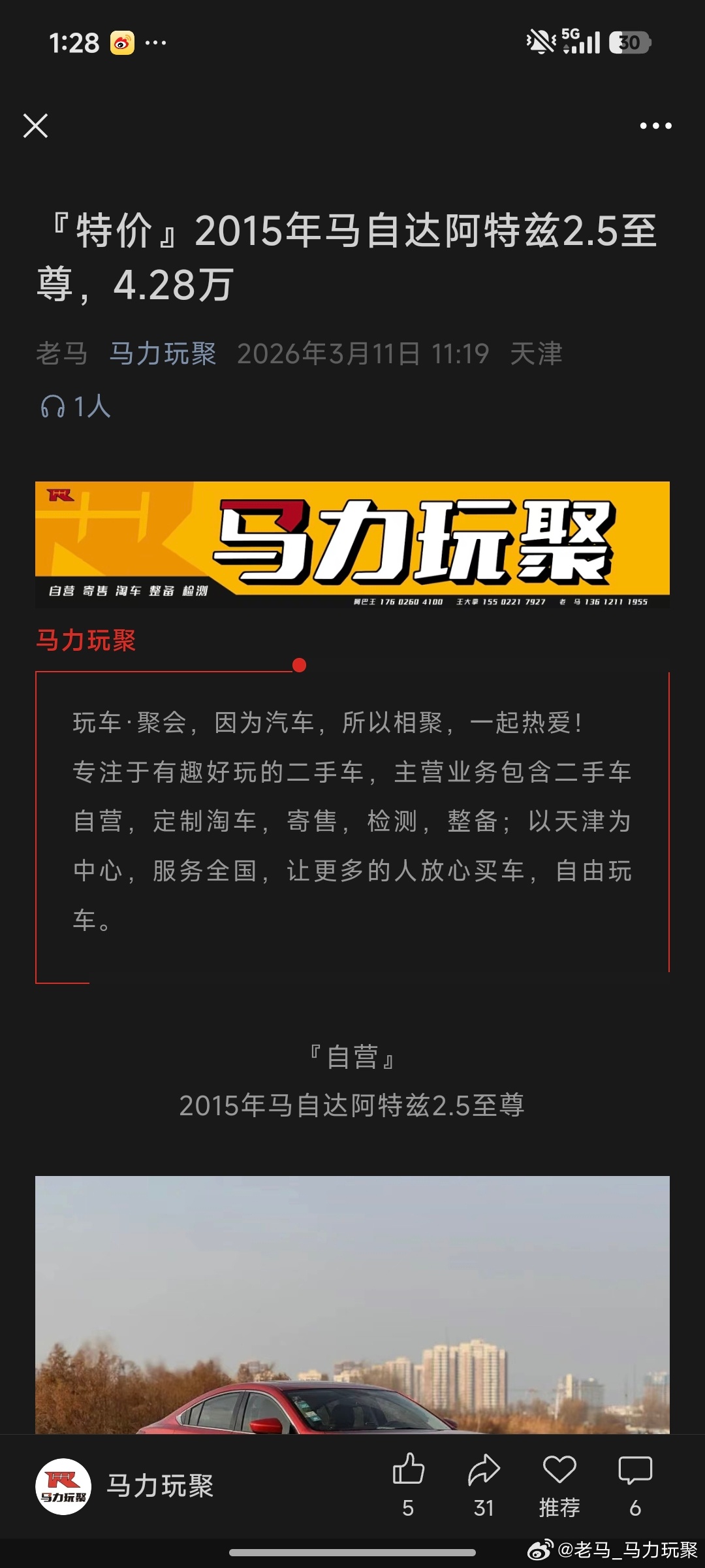 马力玩聚老马在路上 阿特兹卖了,又亏钱了去年12月上架的一台阿特兹2.5顶配同行手里3万大收的(收的时候我信心满满)收回来就发现底盘不太好了哐哐哐整备一通还换了油水定价4万中没想到两个月还没卖掉最后一次是年后调价4.28万平价出结果这车保险到期了客户买车,还给上了一个保险今天做的交付,代驾直接到山东希望2026年卖阿特兹能挣到钱!