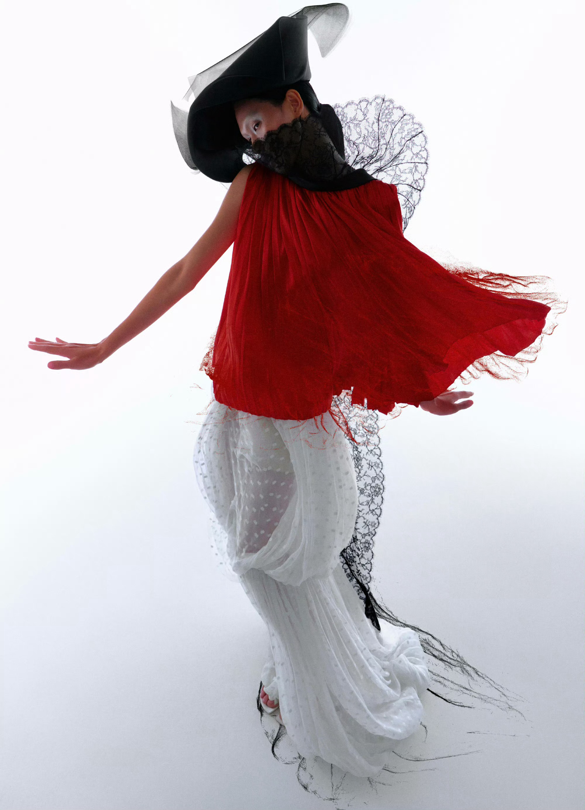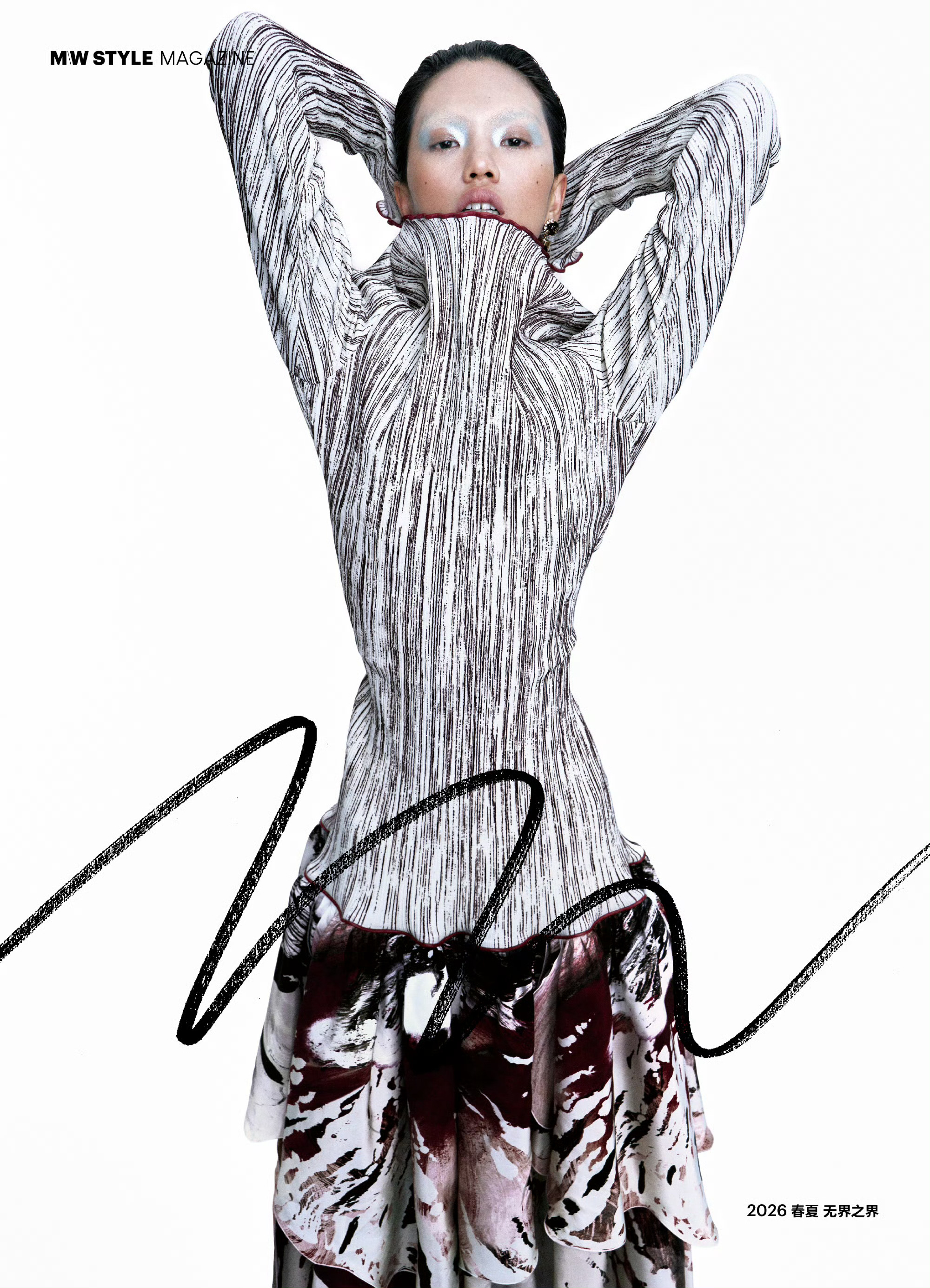 《2026春夏女装特刊——无界之界》“乌卡时代”的定义:没有恒定的脚本,没有单向的演进,一切都在多重变量中震荡、交织、重组。这个概念引入时装表达——当不确定性成为唯一确定,视觉的语法也从“完美定格”走向“流动的稳态”。这是一次从“成衣展示”到“状态捕捉”的转向——光影不避晃动,构图允许留白,质感保留呼吸。时装不再是封存在画面里的理想标本,而是在持续生成的视觉叙事。它不宣告“完成”,只记录“此刻”;不定义风格,只呈现状态。摄影 曾无化妆 Yooyo Keong Ming发型 周学明模特 叶日群