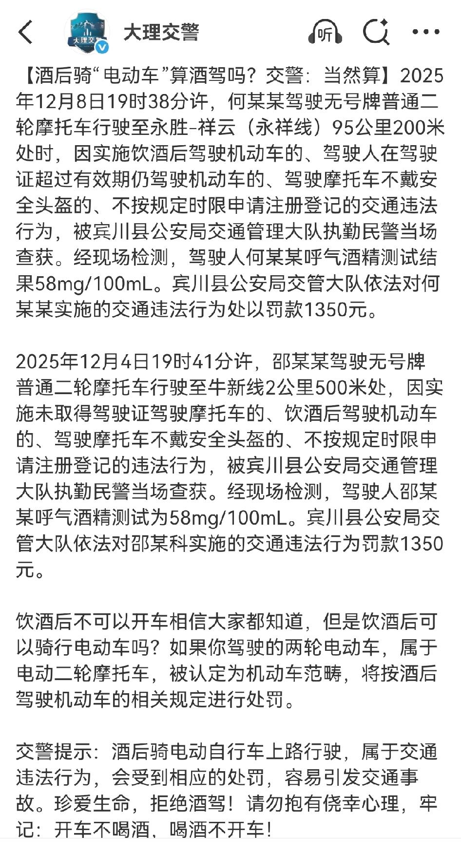 【酒后骑“电动车”算酒驾吗?大理交警:当然算】 酒后骑“电动车”到底算不算酒驾,这里面门道可不少。就像2025年12月8日,何某某骑无号牌普通二轮摩托车被查,呼气酒精测试结果58mg/100mL,妥妥酒驾。 其实,饮酒后骑电动车是否算酒驾得分情况。要是非机动车类的电动自行车,虽未明确算酒驾,但饮酒驾驶有隐患,出事故得担责。 而像电动摩托车、电动三轮车这类机动车,酒后驾驶就是酒驾。酒驾处暂扣驾驶证、罚款;醉驾则吊销驾照,追究刑责,5年内不能重考。所以,不管骑啥车,都别酒后上路,安全第一呀!