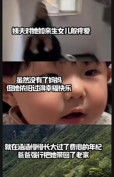 费劲的把孩子带回去,竟然让她成了留守儿童 才17天,就从被捧在手心的小公主变成了模样让人心疼的孩子。 看到甘肃涵涵的事,心里堵得慌,又好无奈。 涵涵的命是真的苦,小小年纪就没了妈妈,2024年2月,她才刚满1岁,还没来得及好好感受妈妈的疼爱,妈妈就因病去世了。 临走前,妈妈最放心不下的就是这个懵懂无知的小女儿,特意把涵涵托付给了自己的母亲和两个姐姐,一遍遍叮嘱,希望她们能替自己好好照顾孩子,让涵涵能在有爱的环境里长大。 涵涵的家在甘肃天祝的大山里,那里交通不便,经济条件也比较落后,爷爷奶奶年纪大了,精力有限。 起初,爷爷奶奶也心疼这个没妈的小孙女,答应了让女儿们抚养涵涵,涵涵的爸爸当时也口头承诺,后续会配合办理相关的抚养手续,安安心心把涵涵交给娘家人照顾,所有人都以为,涵涵能在小姨们的疼爱下,慢慢走出失去妈妈的阴影。 万幸的是,两个小姨真的把涵涵当成了自己的亲闺女,姨夫也格外疼她,家里的好吃的、好玩的,从来都是先给涵涵留着,衣服鞋子也是买最舒服、最合身的。 涵涵太小,记不清自己的妈妈长什么样,在小姨家待久了,就自然而然地喊小姨“妈妈”,喊姨夫“爸爸”。 在小姨身边,她不用受一点委屈,被宠成了名副其实的小公主,每天无忧无虑,脸上总挂着甜甜的笑容,这大概是她失去妈妈后,生命里最暖的一束光。 小姨们也一心想把涵涵照顾好,特意给她报了附近的幼儿托管班,每天按时接送,周末带她去县城里玩,给她买喜欢的玩具和绘本,生怕她因为没有妈妈,心里留下遗憾。 涵涵也依赖小姨,不管走到哪里,都要黏在小姨身边,晚上睡觉也要抱着小姨的胳膊才能安心入睡,那种亲密劲儿,比亲母女还要亲。 可谁能想到,这份安稳和温暖,仅仅维持了一段时间,就被涵涵的爸爸打破了。这个平时对涵涵不管不顾、在涵涵妈妈去世后也没尽过多少父亲责任的男人,突然出现,二话不说,就硬是要把涵涵从小姨身边带走。 小姨们拼命阻拦,反复跟他说涵涵还小,离不开人照顾,可他态度坚决,不管不顾,最终还是把懵懂的涵涵带走,带回了天祝的大山里,交给了年迈的爷爷奶奶照看。 涵涵的爸爸常年在外打工,很少回家,把涵涵交给爷爷奶奶后,就又匆匆离开,从此,涵涵就成了一名留守儿童。 爷爷奶奶年纪大了,眼神不好,手脚也不灵活,只能勉强照顾涵涵的温饱,根本没时间陪她玩耍、哄她开心,更别说像小姨那样细心呵护她。 小姨们放心不下,仅仅过了17天,就迫不及待地凑钱买了车票,一路辗转,翻过大山,赶到了涵涵的爷爷奶奶家。 远远地,小姨就看到了涵涵,才17天的时间,那个曾经白白嫩嫩、穿着干净衣服的小公主,完全变了模样。 她穿着不合身的旧衣服,脸上沾着灰尘,头发乱糟糟的,眼神也变得怯生生的,再也没有了以前的活泼灵动,安安静静地坐在院子里的小板凳上,低着头,一副无精打采的样子。 涵涵也一眼就看到了小姨,眼睛瞬间亮了起来,脱口就喊出了“妈妈”,声音里满是委屈和依赖。可就在涵涵想扑向小姨的时候,奶奶却死死地抱着她,不让她靠近,嘴里还不停地念叨着什么。 涵涵急得直哭,小手拼命挣扎,嘴里大声喊着“放开我,我要妈妈,我要小姨”,那撕心裂肺的哭声,听得人揪心不已。 小姨看着涵涵的模样,心都碎了,眼泪止不住地往下掉,一遍遍地跟奶奶商量,让自己抱抱孩子,可奶奶始终不肯松手。 僵持了好一会儿,奶奶才松了手,涵涵一下子就扑进了小姨的怀里,紧紧抱着小姨的脖子,哭得更凶了,仿佛要把这17天里所有的委屈、孤独和害怕,都哭出来。 后来大家才知道,涵涵在大山里的这17天,过得格外辛苦。爷爷奶奶每天要忙着地里的农活,经常顾不上给她按时吃饭,有时候涵涵饿了,就只能吃一些凉掉的馒头和咸菜。 晚上睡觉,没有人给她讲故事、盖被子,她经常半夜醒来,哭着喊“妈妈”,却没有人回应;身上的衣服脏了,也没有人及时给她换洗,慢慢就变得脏兮兮的,再也没有了以前小公主的模样。 涵涵的小姨们看着心疼,想把涵涵再接回去,可涵涵的爸爸却始终不松口,也不配合办理抚养手续。 当地的村两委和妇联得知情况后,也多次上门调解,劝说涵涵的爸爸,考虑到涵涵的成长,让她留在小姨身边,可涵涵的爸爸依然态度坚决,不愿意妥协。 目前,涵涵依然在大山里跟着爷爷奶奶生活,小姨们只能经常抽时间过去看她,给她带好吃的、新衣服和玩具,陪她待上一会儿,缓解她的孤独。 很多人得知涵涵的事情后,都十分心疼这个小小的孩子,也希望涵涵的爸爸能多为孩子着想,让她能在有爱的环境里健康长大。 目前,小姨已经开始咨询律师,准备通过法律途径争取涵涵的抚养权。她表示,自己不求别的,只希望涵涵能回到身边,继续做被宠爱的小公主,在爱里长大。